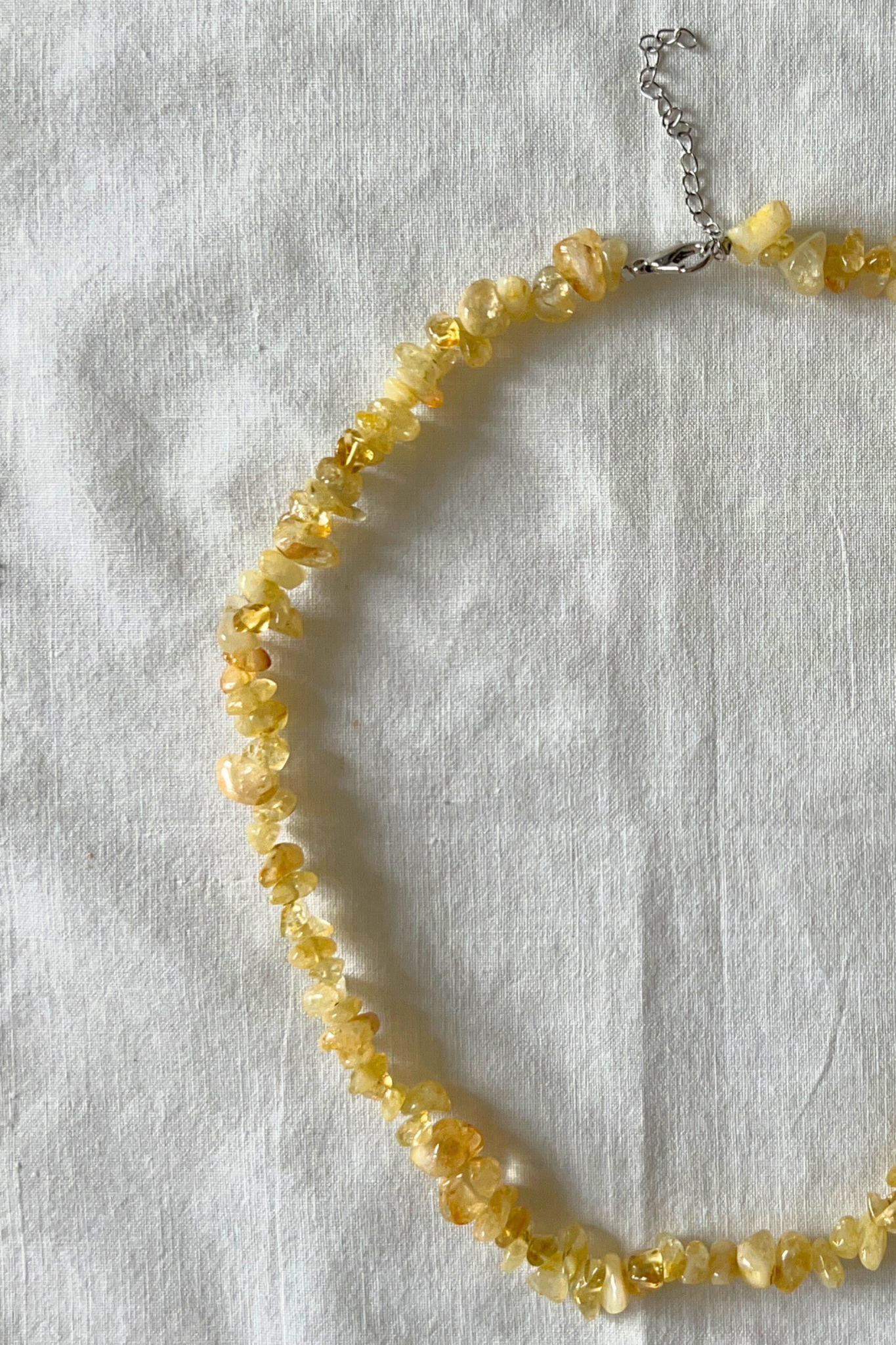A delicate necklace crafted from natural citrine, featuring warm golden tones that catch the light beautifully. The irregular chip stones create a soft, organic texture, giving the piece a light and effortless feel.