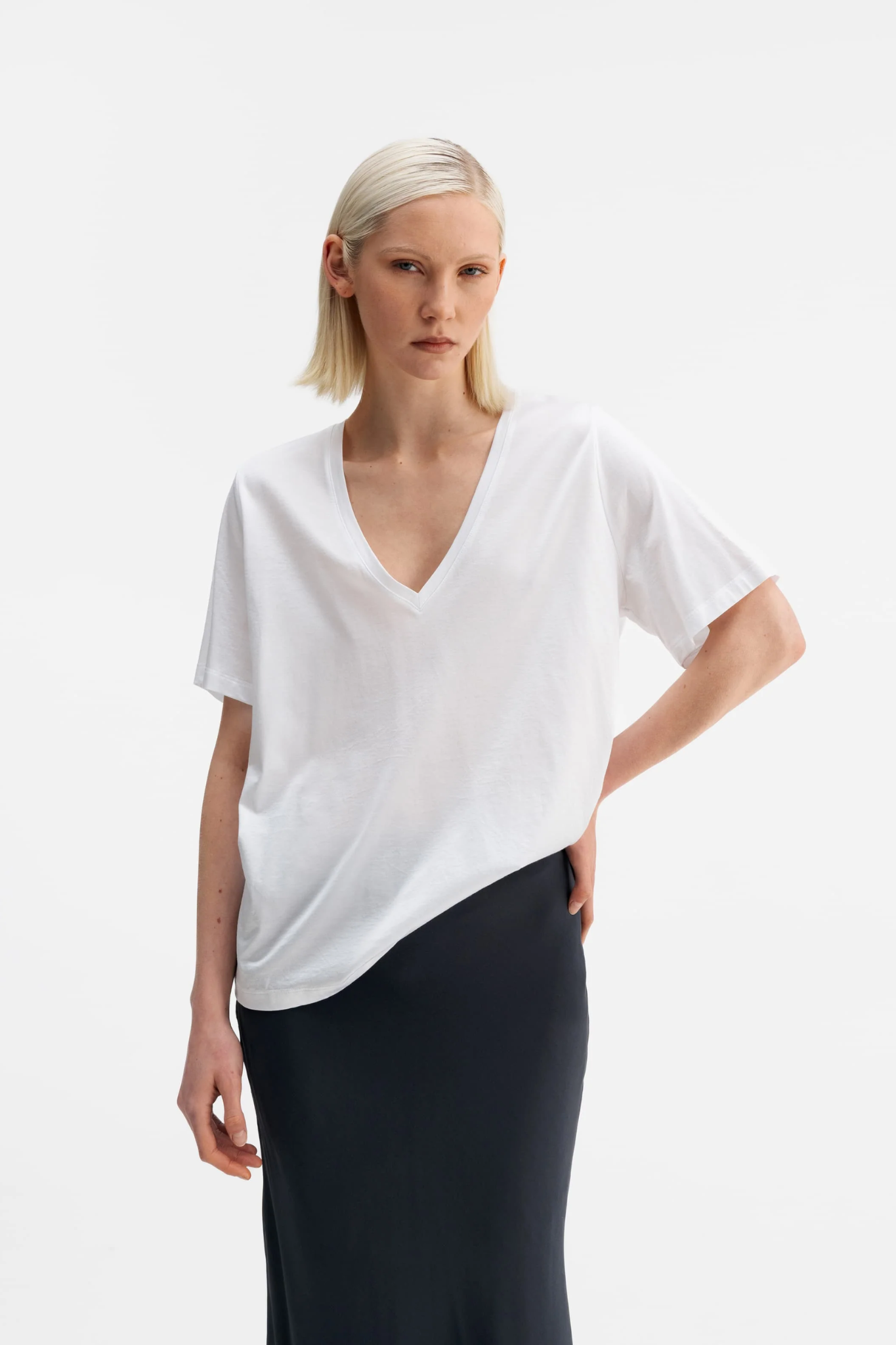 AHLVAR GALLERY OKI V-NECK TEE WHITE is made from a lightweight viscose-blend fabric with a subtle sheer effect and a soft, shiny finish. Designed with a relaxed fit and a deep V-neckline, it creates an effortless and feminine silhouette.