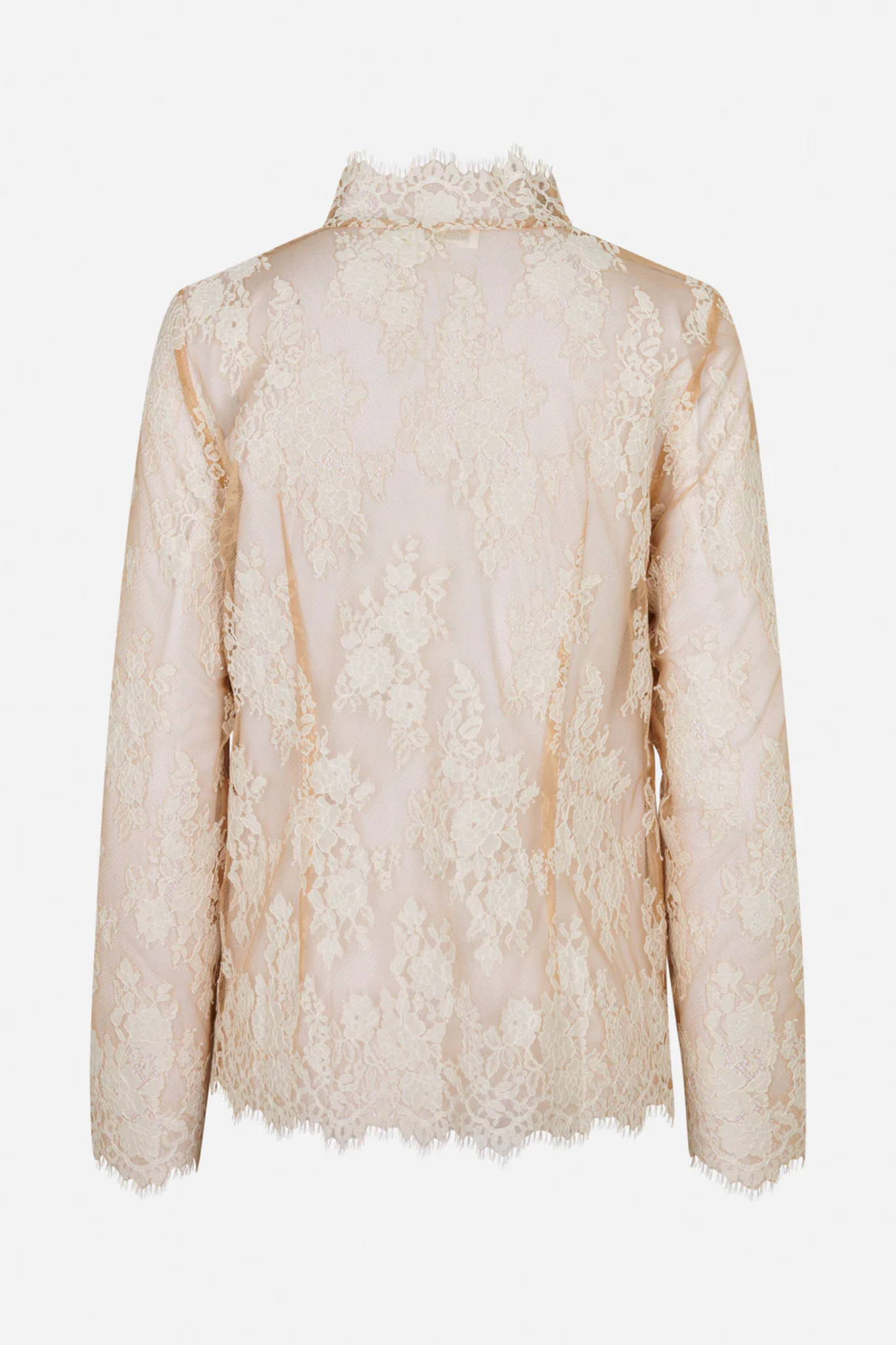 BAUM UND PFERDGARTEN MEELAH BLOUSE FRAPPE BEIGE is an elegant lace blouse designed in sheer two-toned fabric for a sophisticated and feminine look. The relaxed fit is complemented by soft pleats at the back, creating a gently shaped silhouette with beautiful movement.