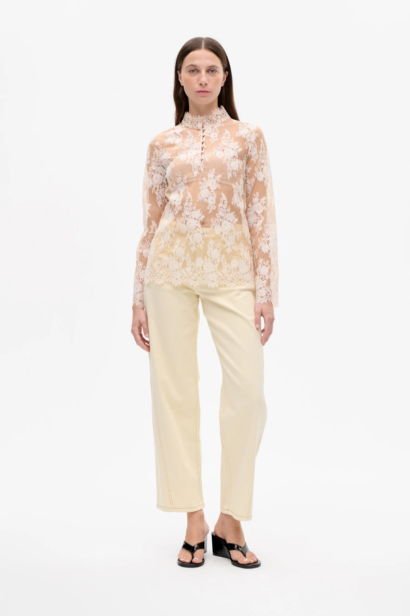Featuring a stand-up collar and button closure at the chest, this versatile blouse is perfect for both everyday wear and special occasions. Style it with tailored trousers, denim, or a skirt for a refined and modern outfit.