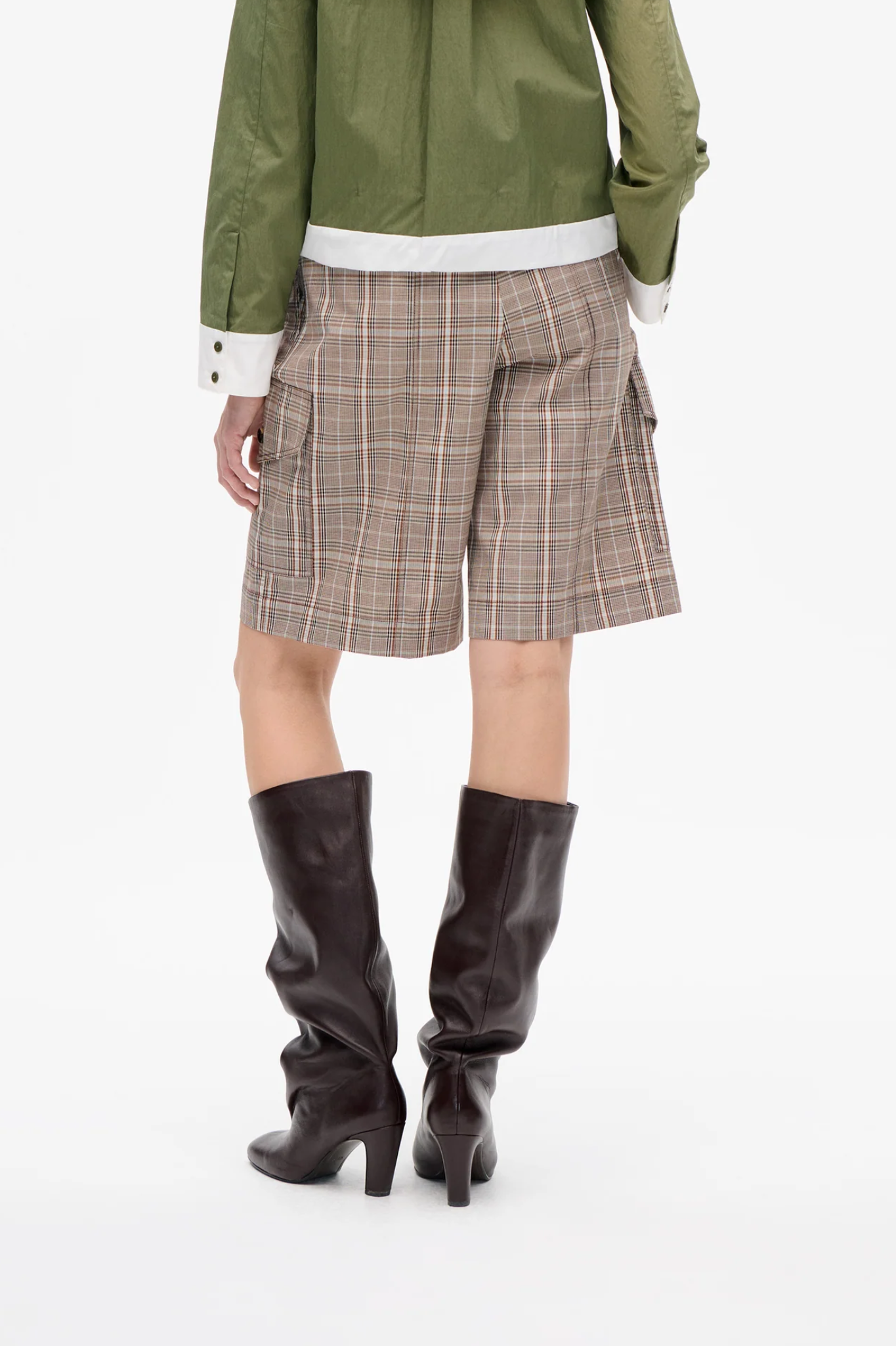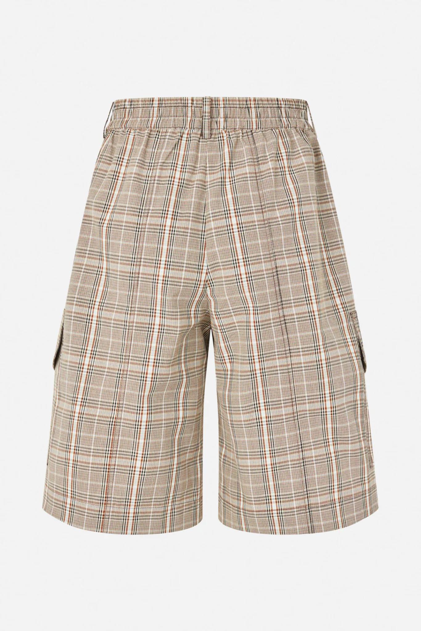 The BAUM UND PFERDGARTEN Neeto Shorts – Brown Mini Check are high-waisted, knee-length Bermuda shorts crafted from a blend of organic cotton and recycled polyester. Designed with a relaxed fit, they combine comfort with a modern, stylish silhouette.