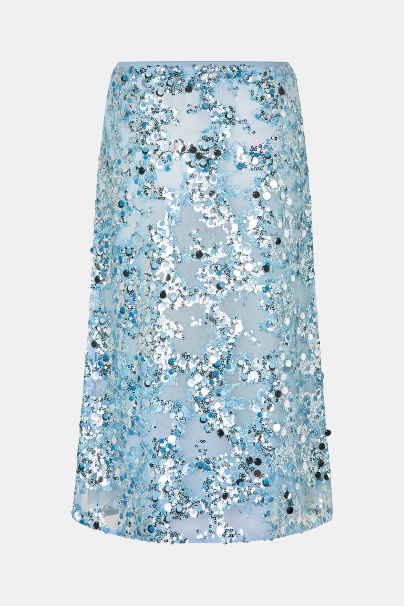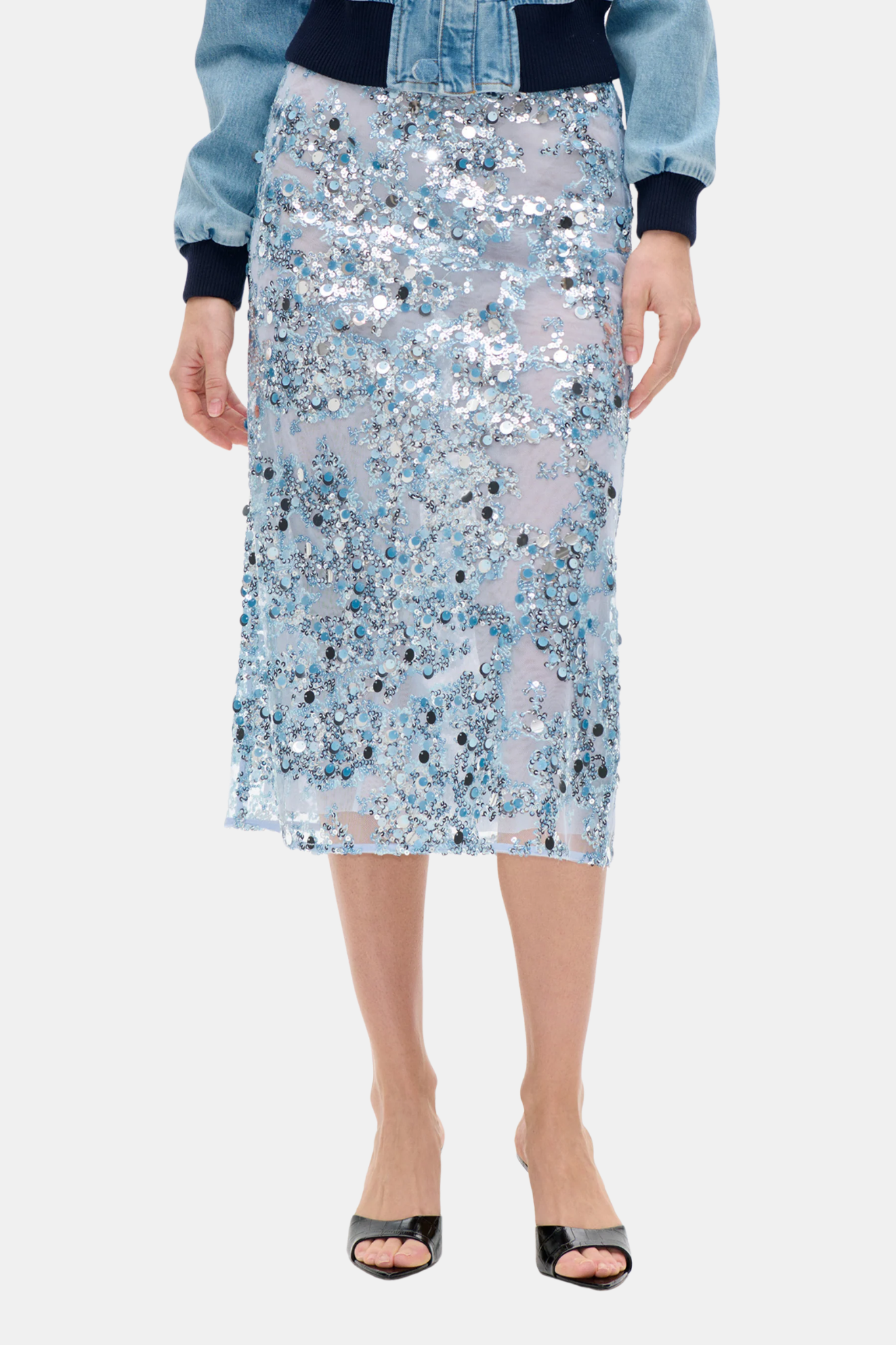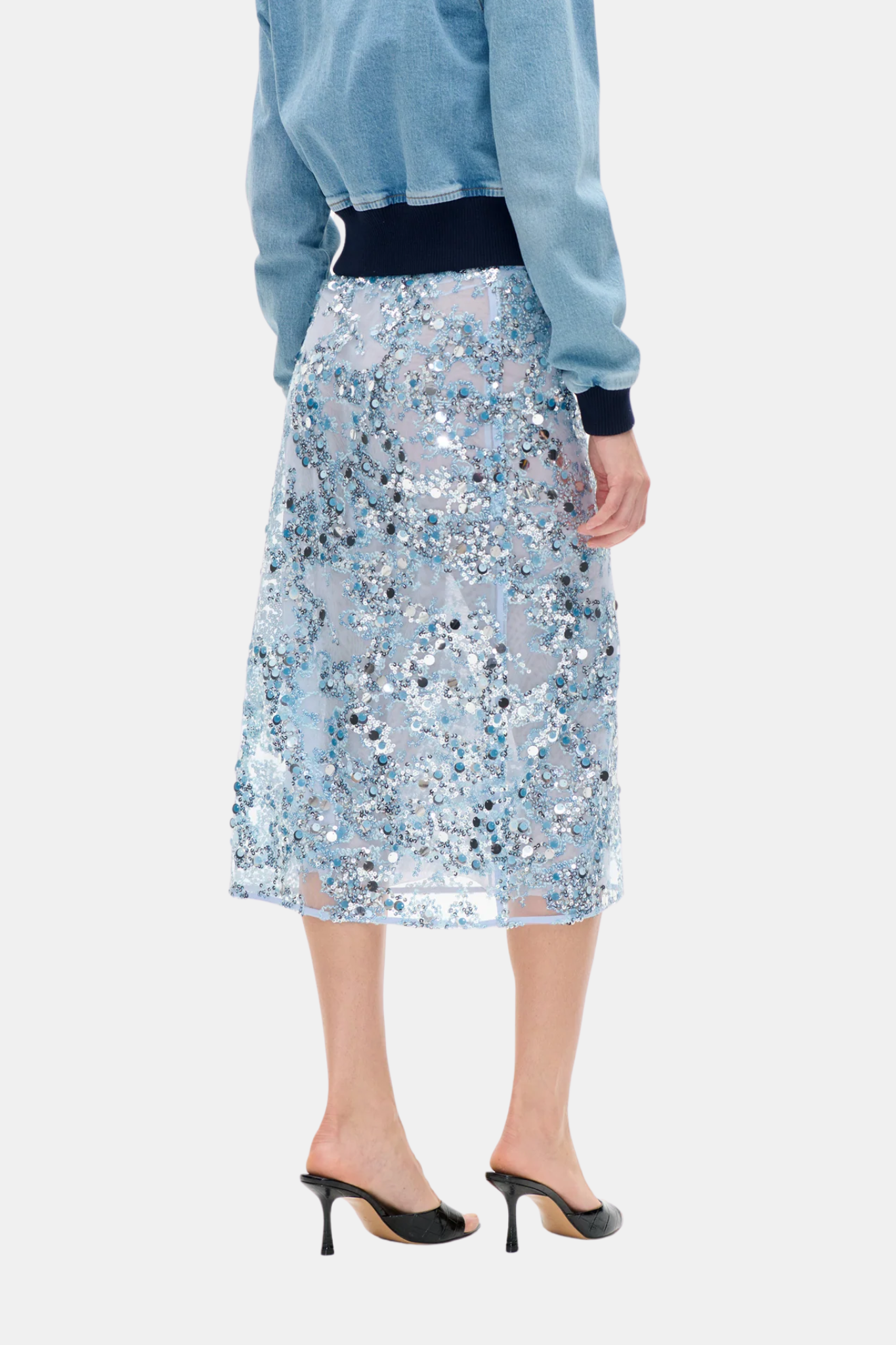 Shine effortlessly in the Shania Skirt from Baum und Pferdgarten. This high-waisted midi skirt in Kentucky Blue is crafted from mesh with shimmering sequin detailing, creating a flattering and modern silhouette. Designed with an elastic waistband and full lining for comfort, it’s perfect for both everyday styling and special occasions.