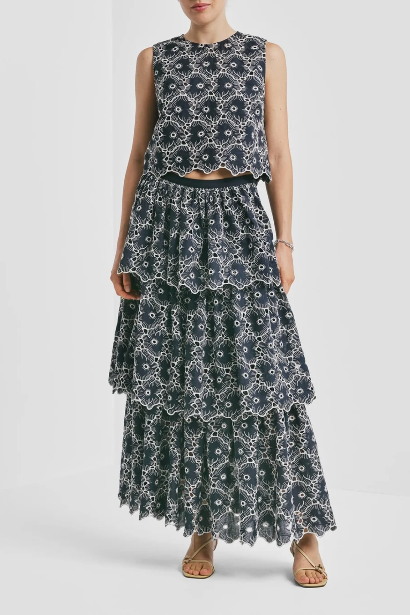 BY TIMO BRODERIE ANGLAISE TOP MARINE is a delicate and feminine top crafted from light and soft GOTS-certified cotton. Designed with a straight, slightly cropped silhouette, it features a clean round neckline and a sleeveless cut for a fresh, modern look.