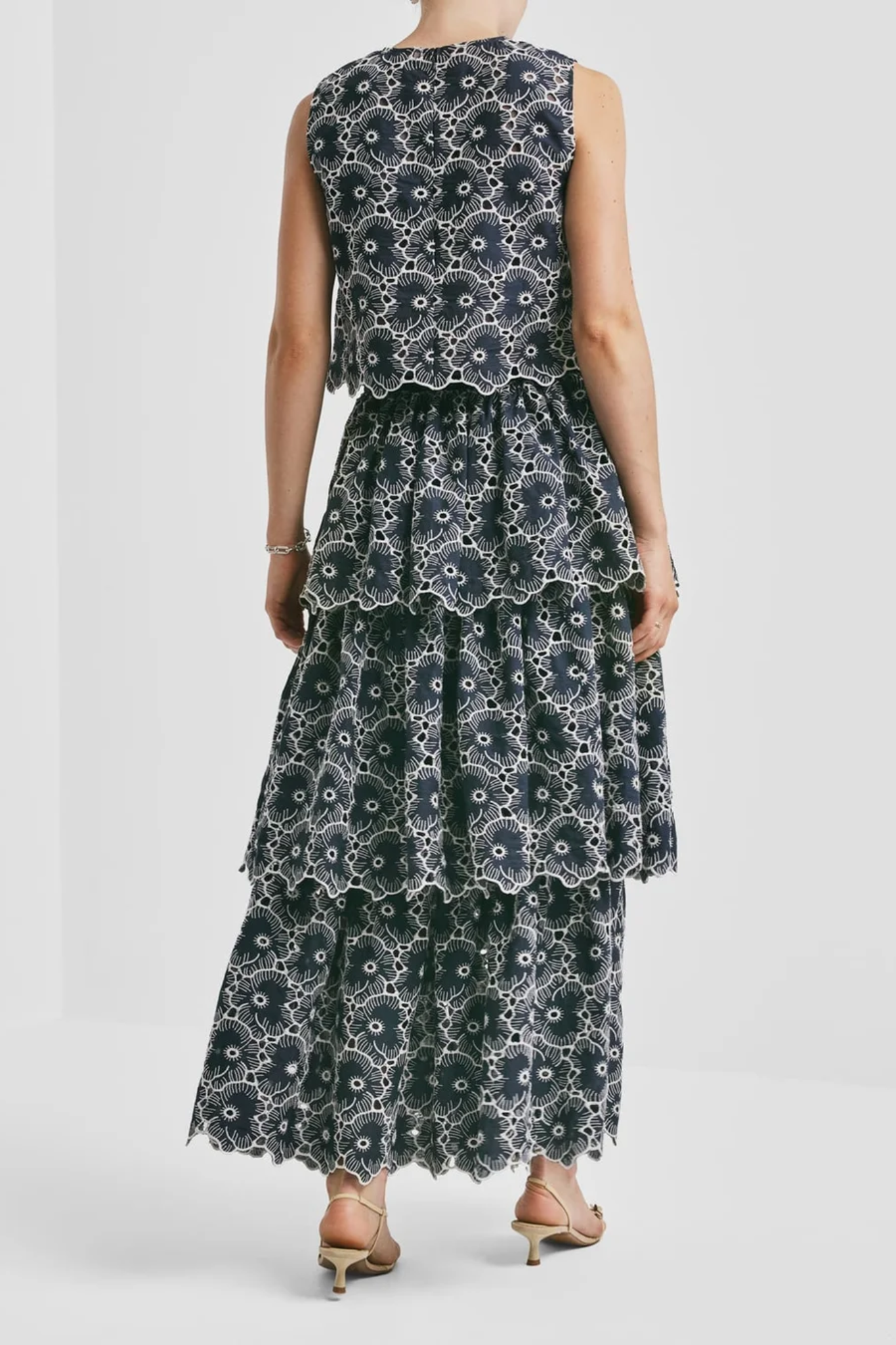 Covered in intricate broderie anglaise detailing, it adds texture and elegance to the design. Finished with a zipper closure at the back, this versatile top is perfect for both everyday wear and more dressed-up occasions.