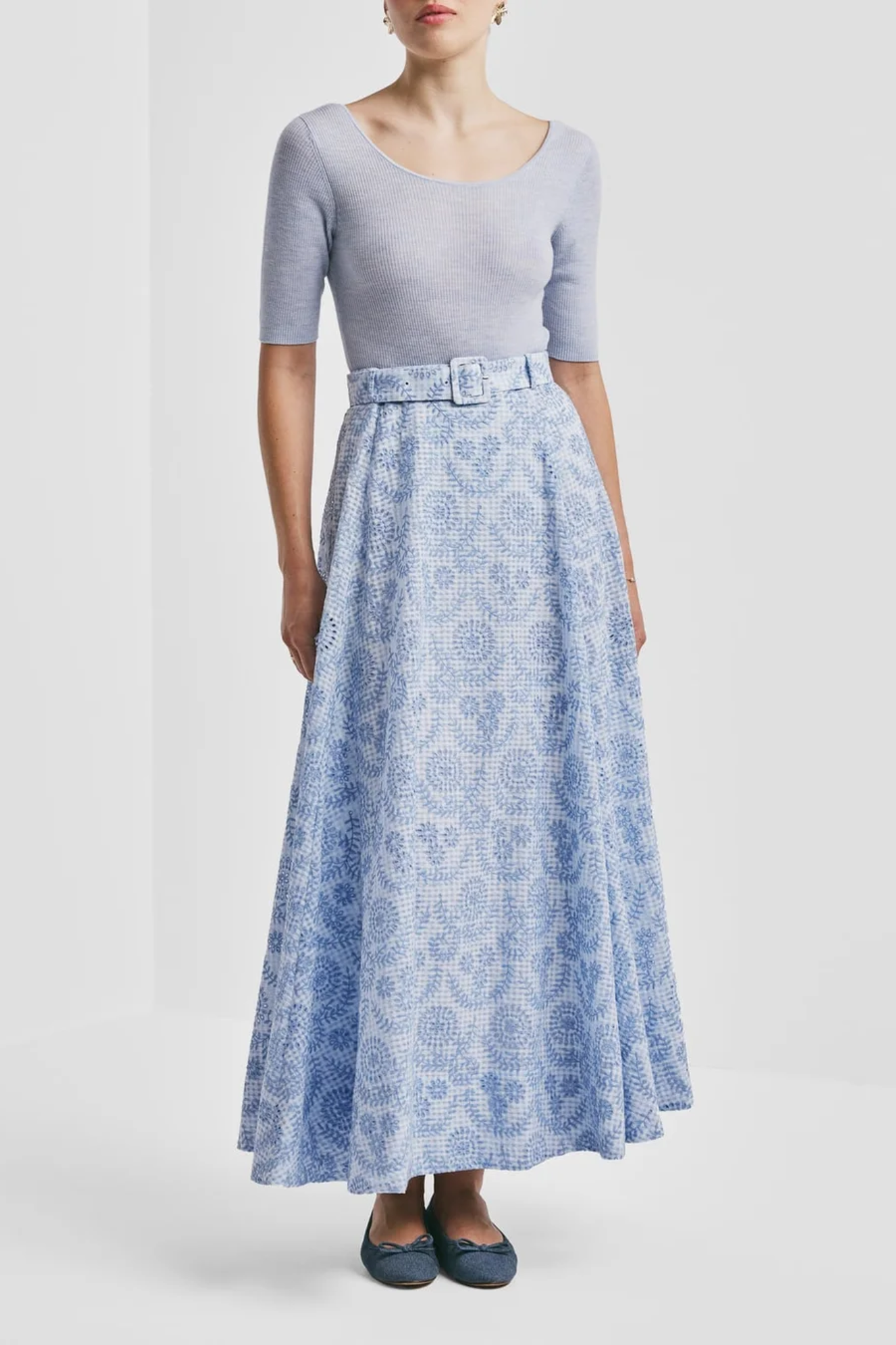The skirt features delicate embroidery details, a matching belt to define the waist, and a discreet side zip closure for a clean finish. Perfect for both everyday wear and special occasions, style it with a blouse, knit, or a simple top for a complete and timeless outfit.