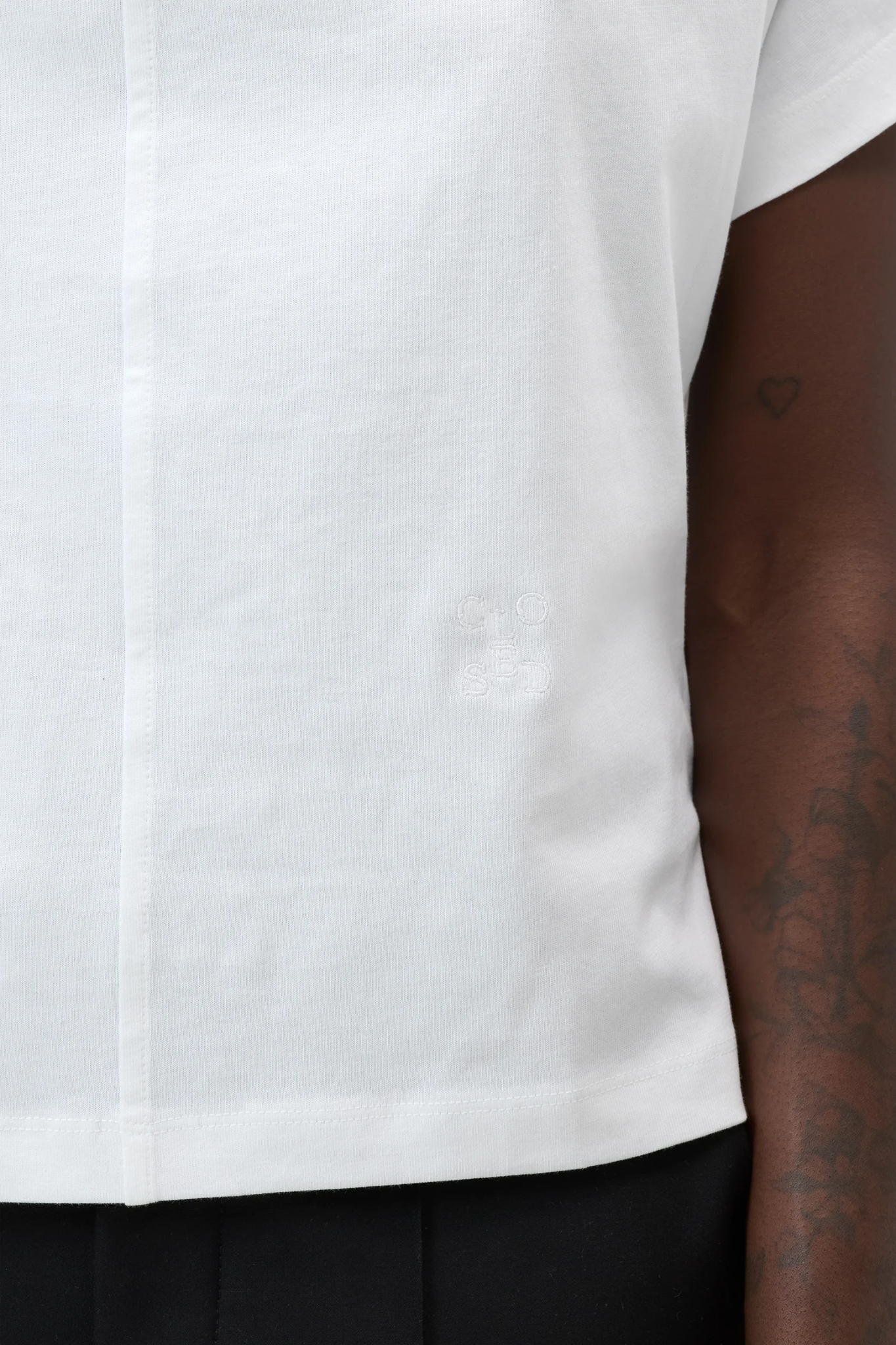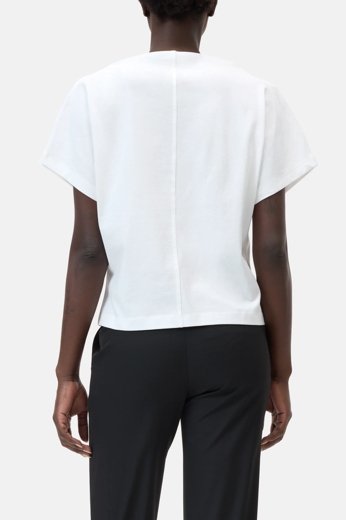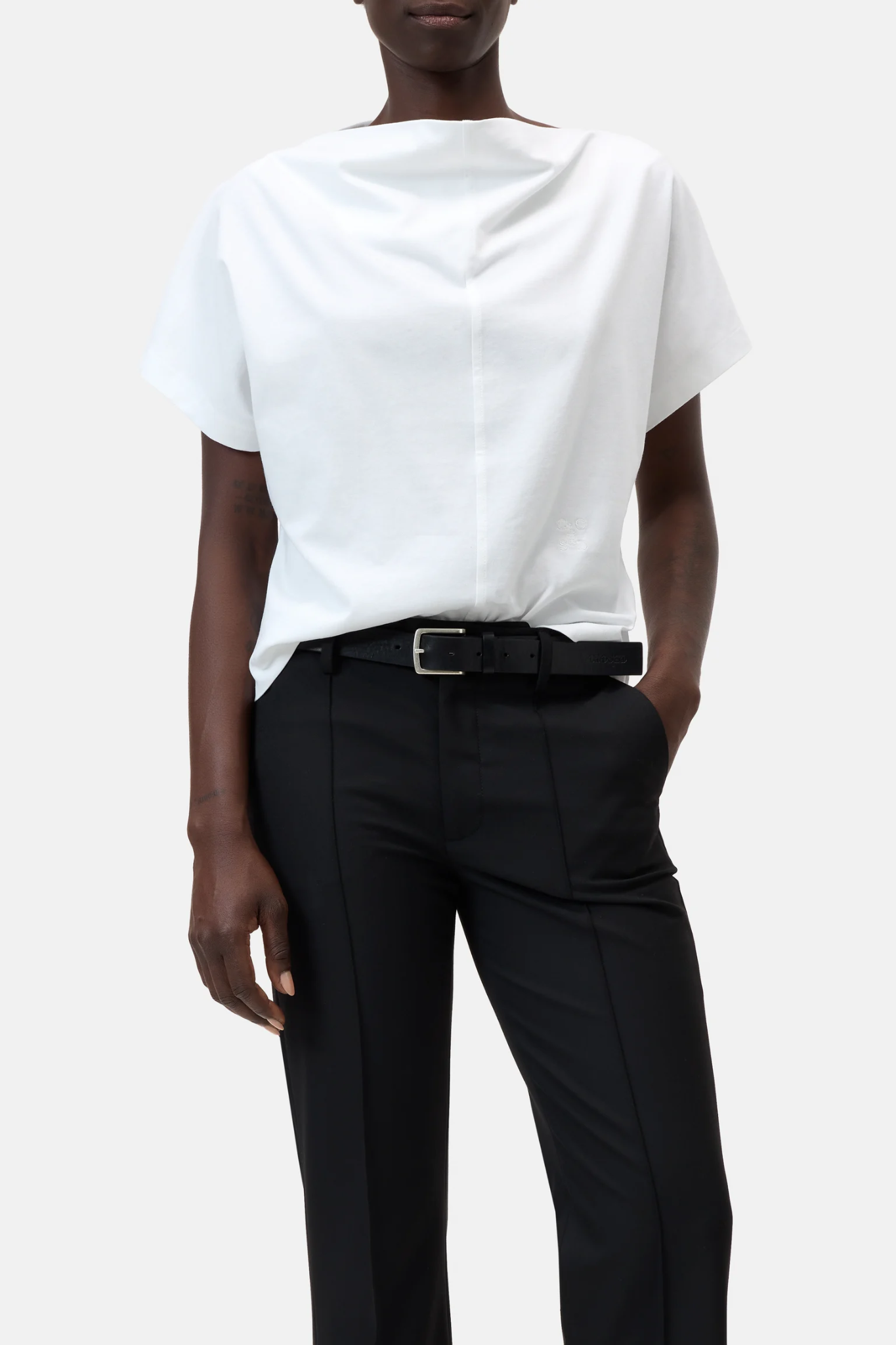 CLOSED DRAPED NECK T-SHIRT WHITE is an elegant T-shirt crafted from clean, compact single jersey in 100% organic cotton. The standout draped neckline creates a soft, flowing silhouette, while thoughtful seaming on the front and back adds subtle structure and refinement.