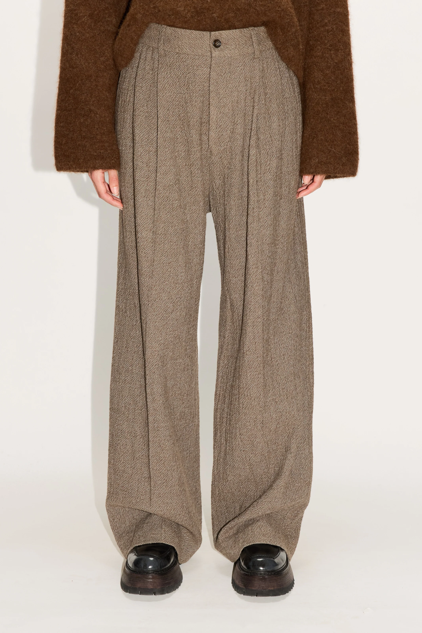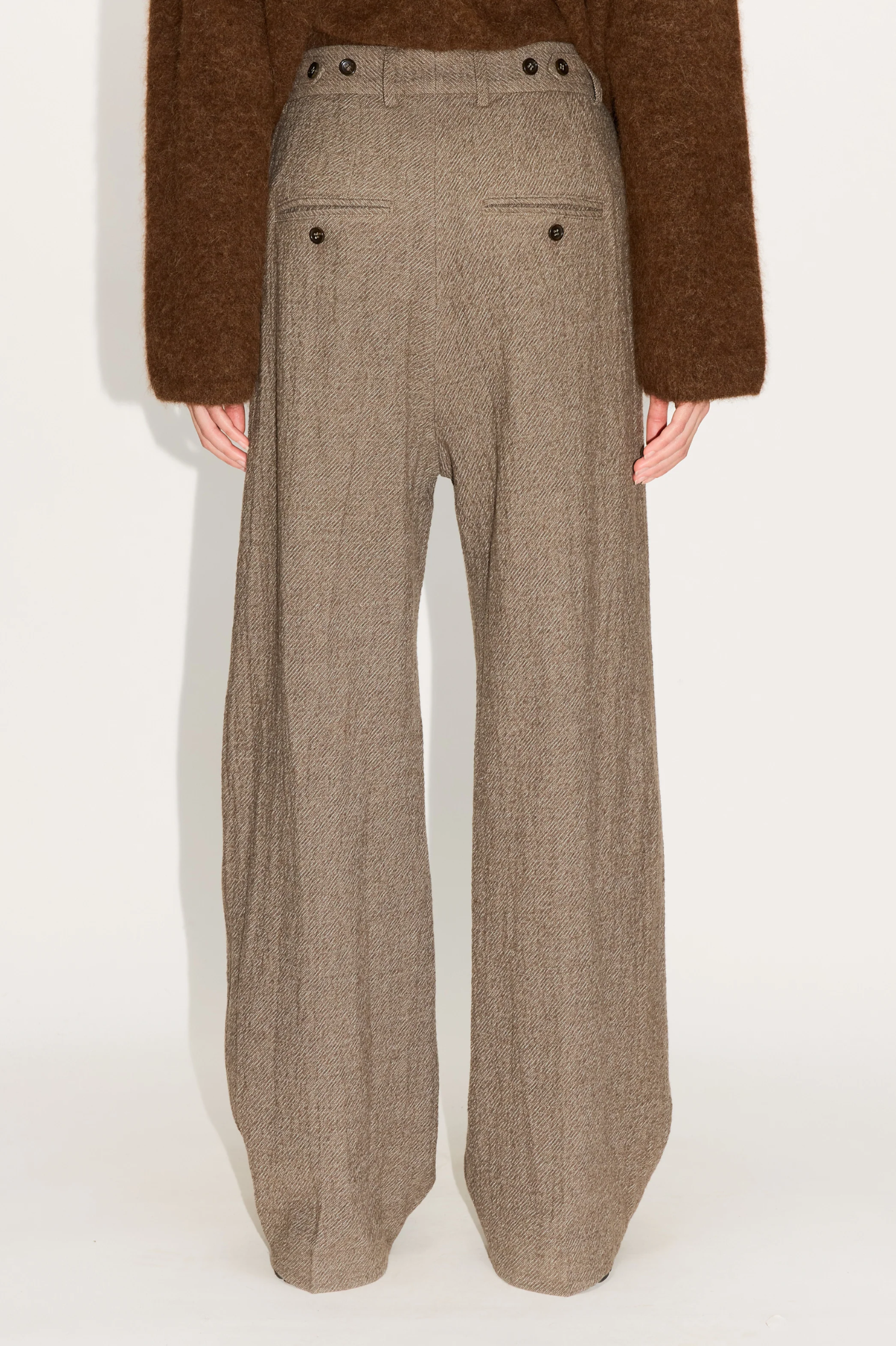 The Fire Trousers from HOPE Stockholm offer a contemporary take on tailored pants with their extra wide-leg fit and elegant beige melange twill. Crafted from a textured wavy fabric, these women’s wide-leg trousers feature front pleats for a polished look and adjustable waist straps for a personalized fit. The versatile neutral tone makes them perfect for both office wear and elevated casual styling. Pair with the Strava Blazer for a modern matching suit.