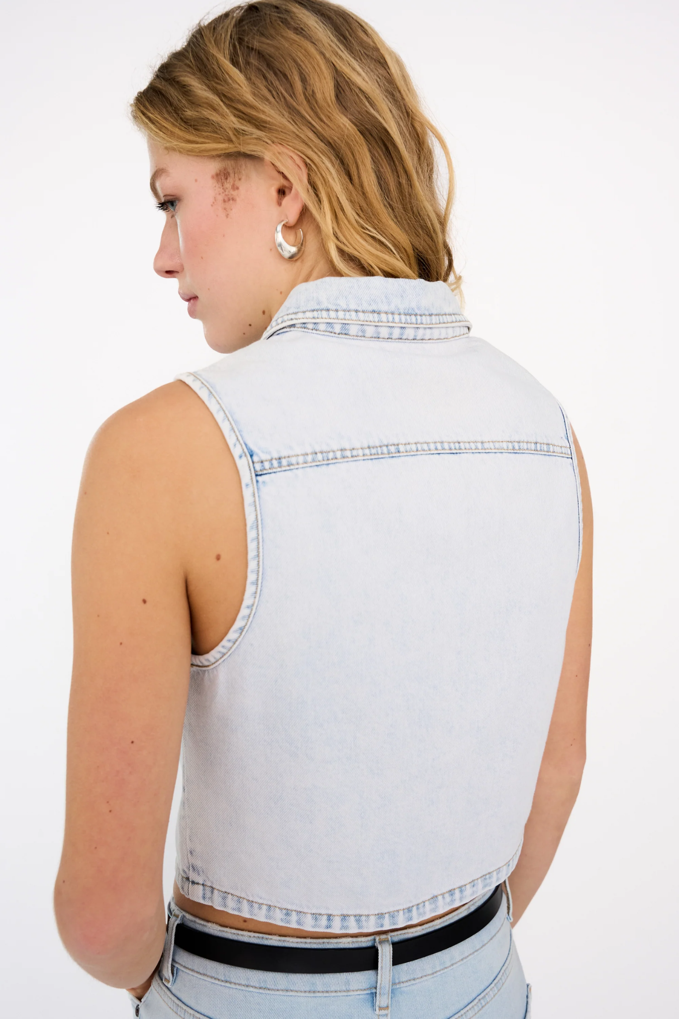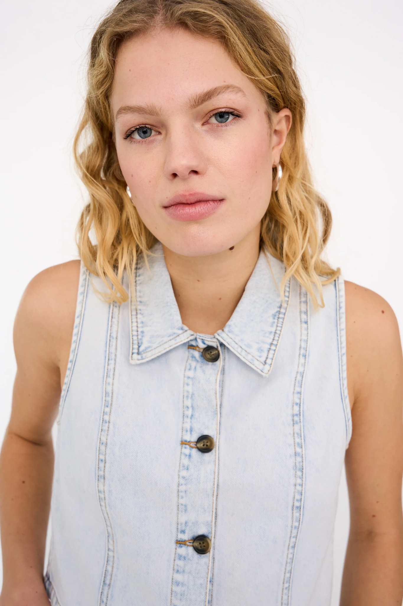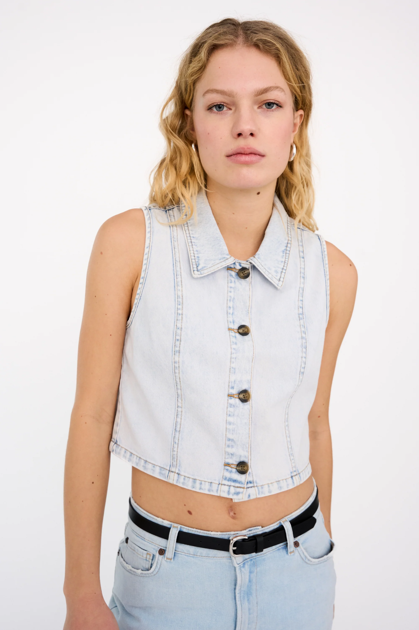 IVY KARLA VEST WASH EDEN PARK is a modern denim layer crafted from washed light blue denim for a fresh and effortless look. Designed with a boxy silhouette and structured seams, it offers a clean and contemporary feel that adds edge without bulk.