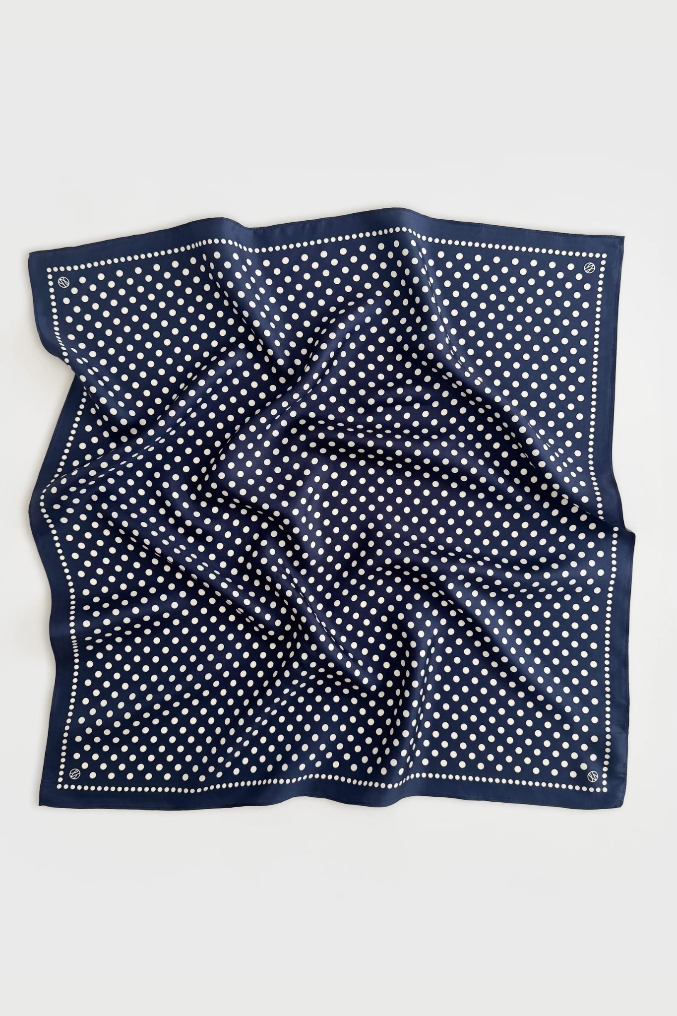 A timeless silk scarf in navy with cream polka dots, crafted from 100% silk for a smooth feel and elegant shine. The classic pattern and deep navy tone create a refined accessory that complements both everyday outfits and more polished looks.