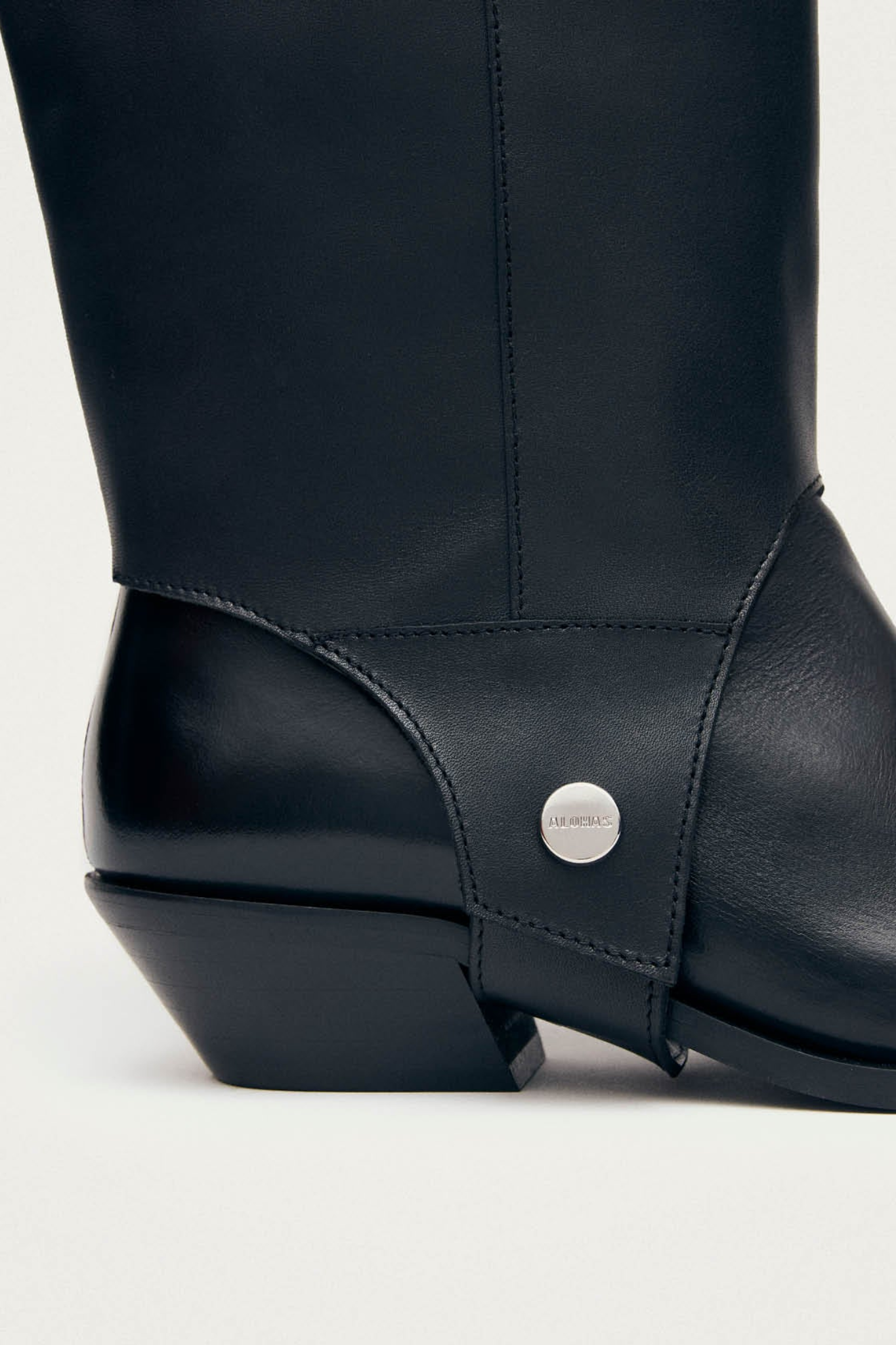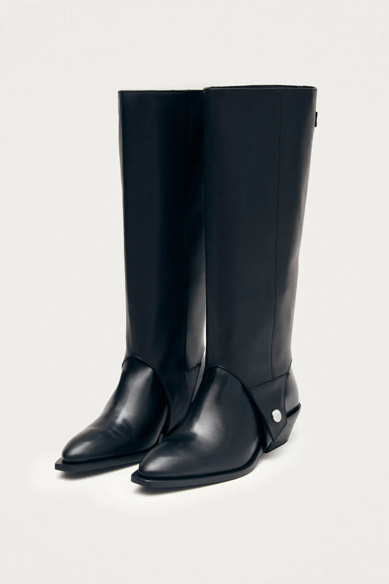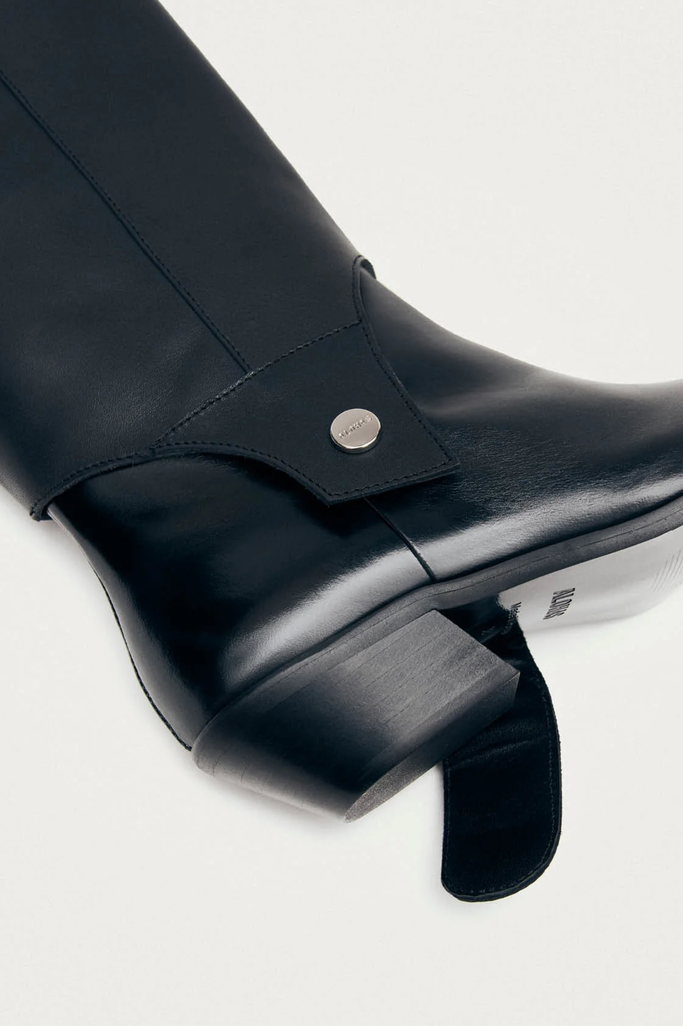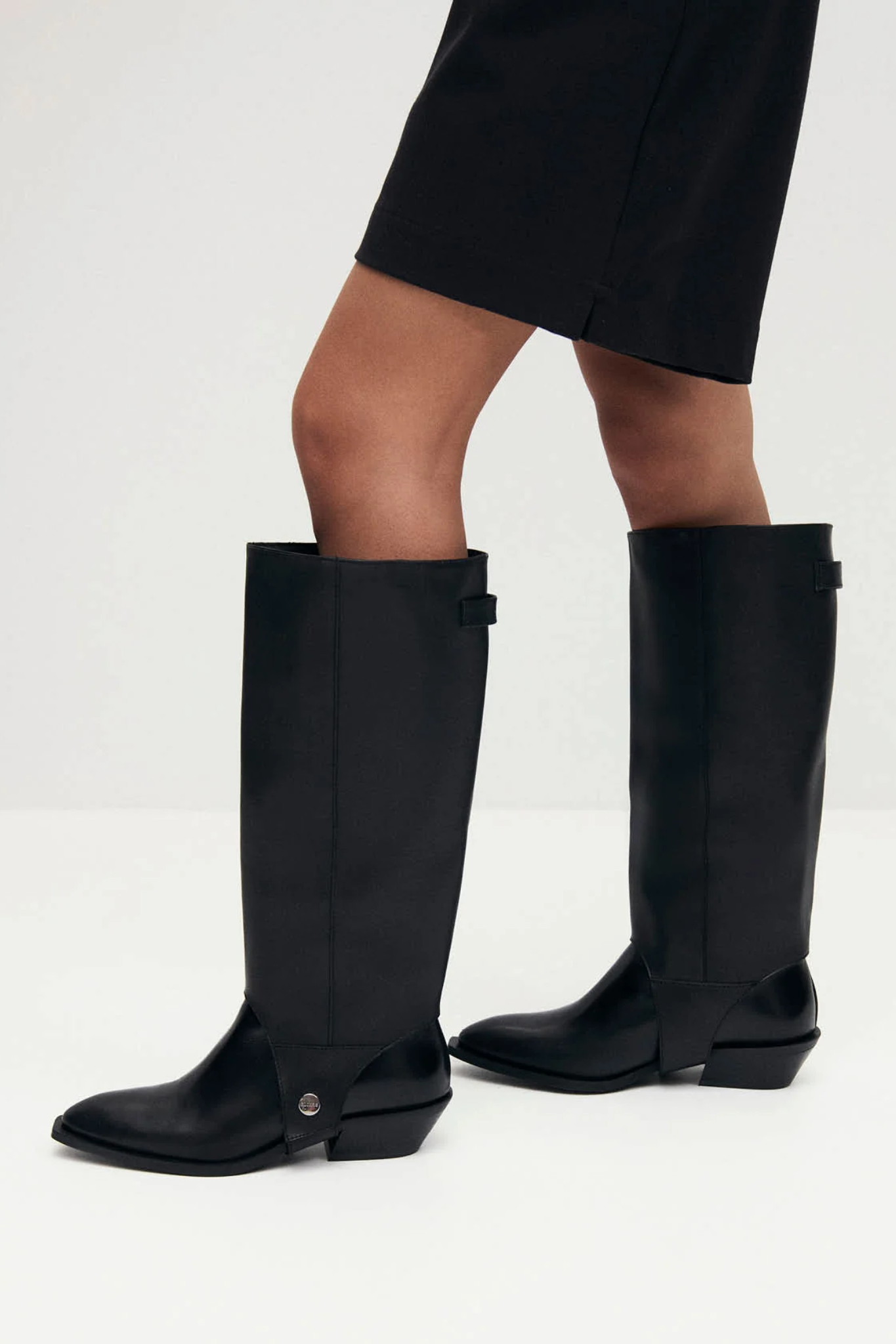 The Maverick Black Leather Boots are a versatile 2-in-1 footwear essential, combining Western-inspired ankle boots with convertible riding boot functionality. Crafted from premium black leather, these boots feature a pointed toe, detailed stitching, and distinctive cowboy and riding-inspired elements. The adjustable shaft attaches with a simple click closure, allowing you to switch effortlessly between styles. Perfect for elevating both casual and statement looks.