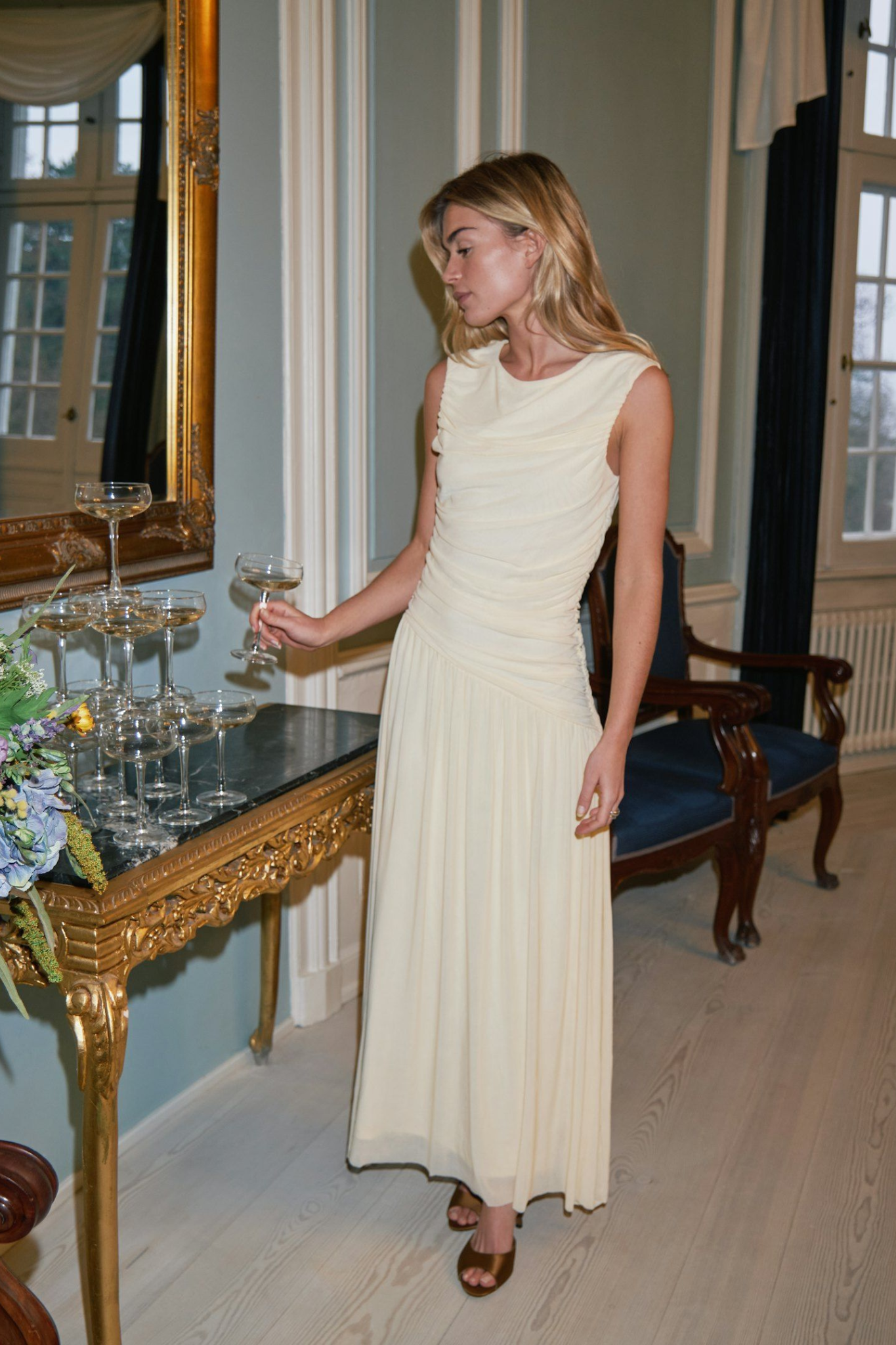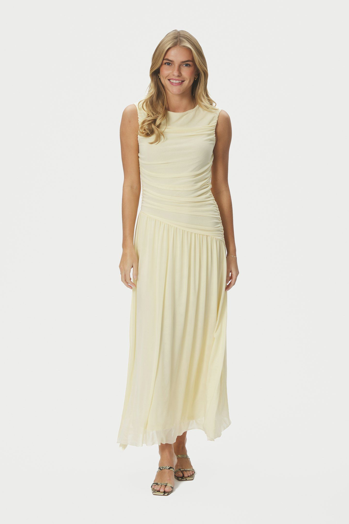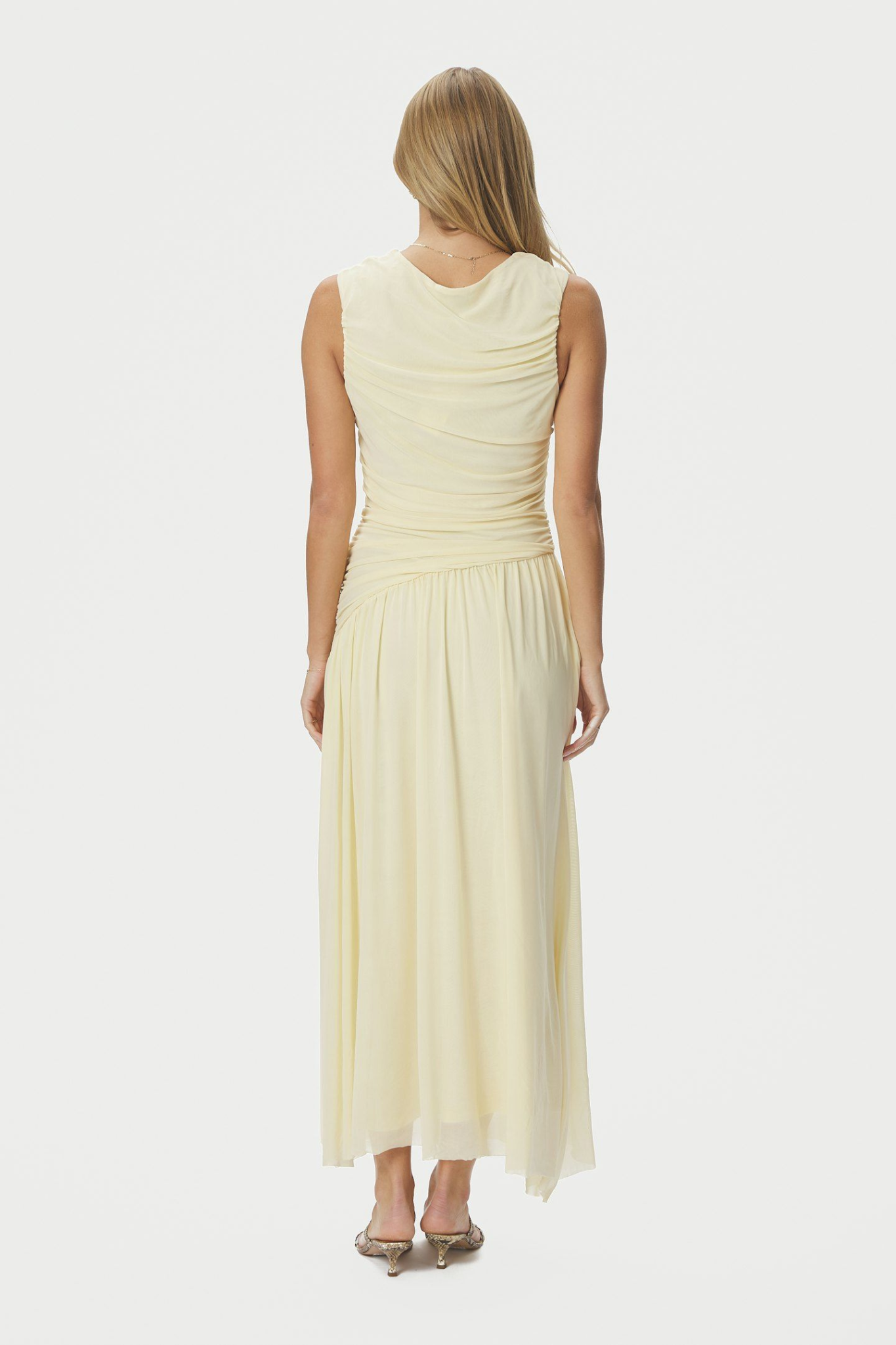 NEO NOIR CLUDINE MESH DRESS LIGHT YELLOW is a feminine and airy maxi dress crafted in soft mesh fabric with a delicate smocked seam detail that flows into a beautifully draped skirt. Designed in a light yellow shade, it creates an elegant and romantic silhouette perfect for special occasions.