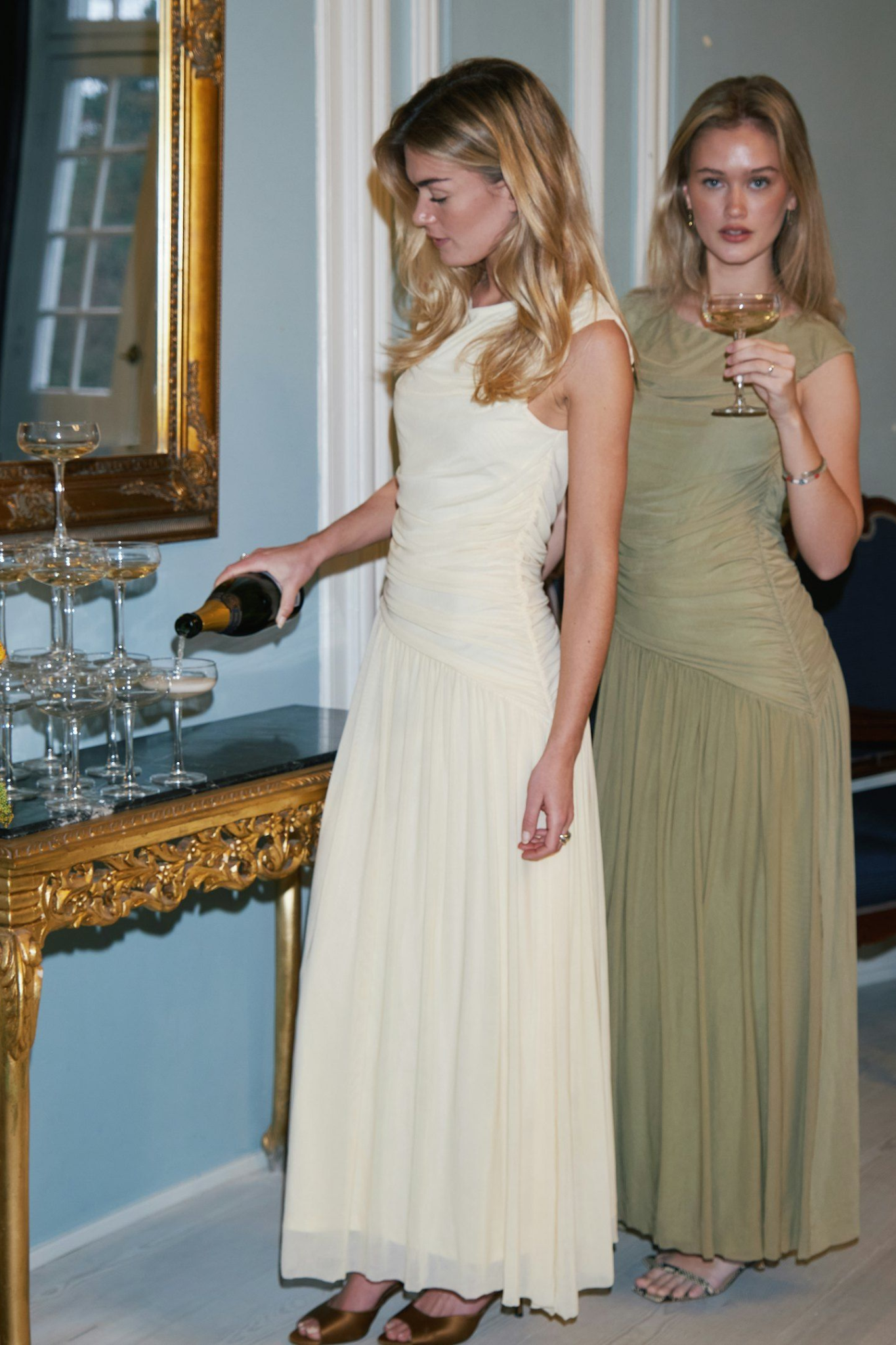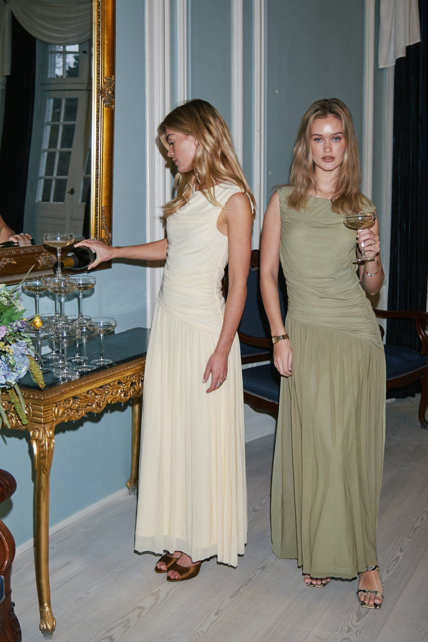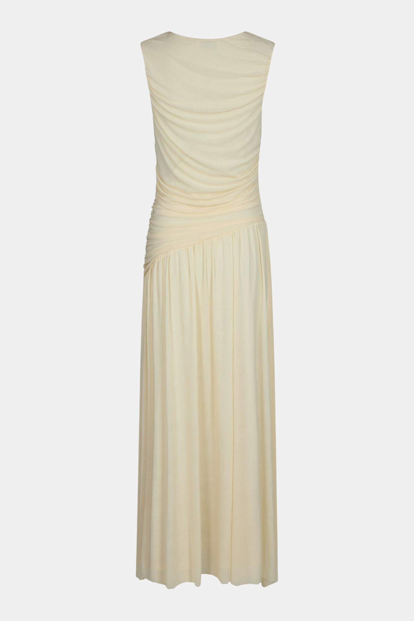 NEO NOIR CLUDINE MESH DRESS LIGHT YELLOW is a feminine and airy maxi dress crafted in soft mesh fabric with a delicate smocked seam detail that flows into a beautifully draped skirt. Designed in a light yellow shade, it creates an elegant and romantic silhouette perfect for special occasions.