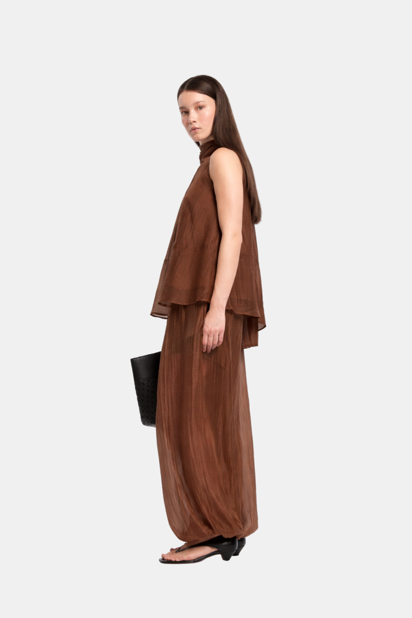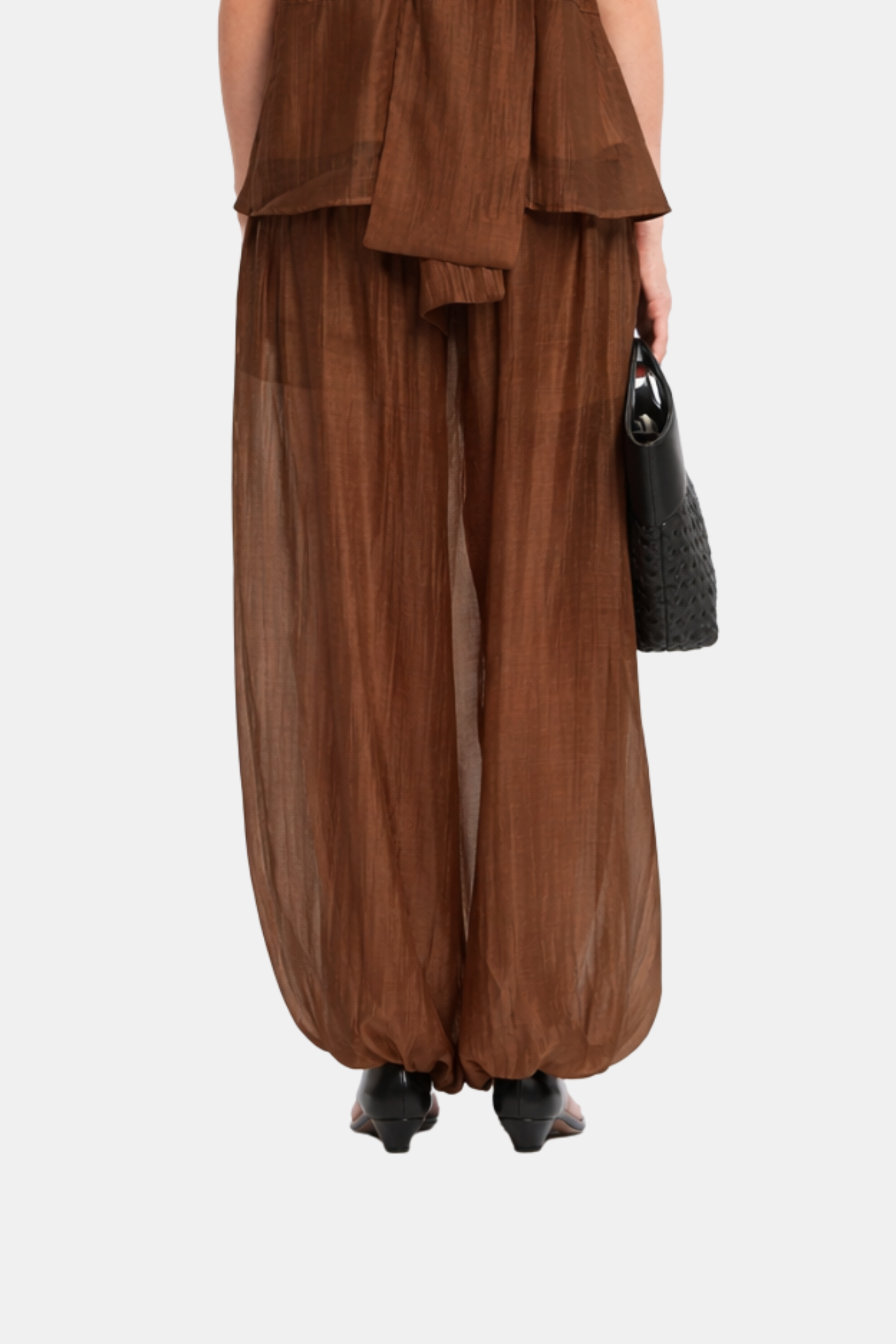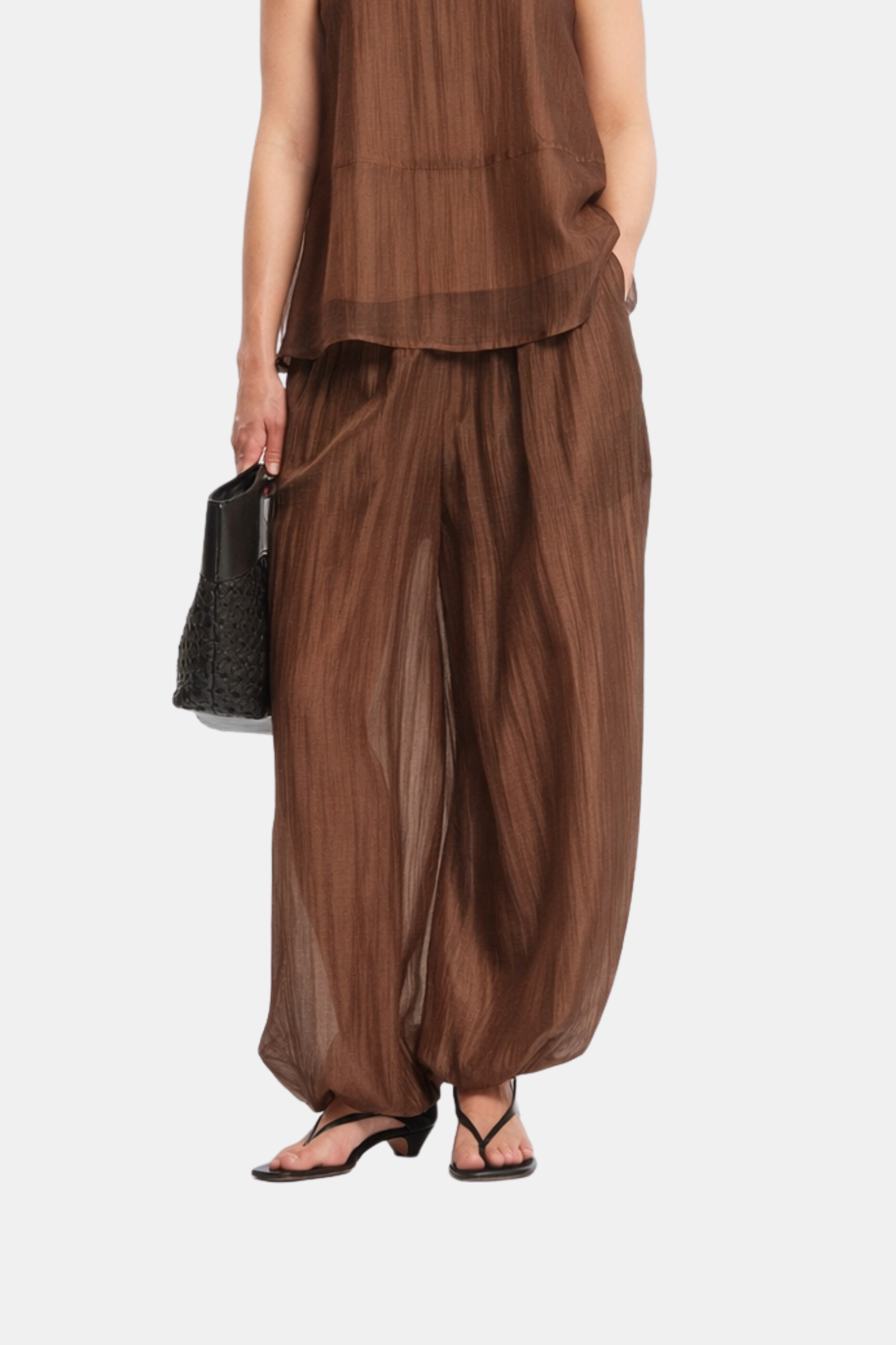 Lightweight wide-leg pants in a soft, semi-sheer textured fabric. Designed with a relaxed silhouette and elasticated hems that create a subtle balloon shape. Airy, elegant, and perfect to style with the matching top or a simple tank for an effortless summer look.