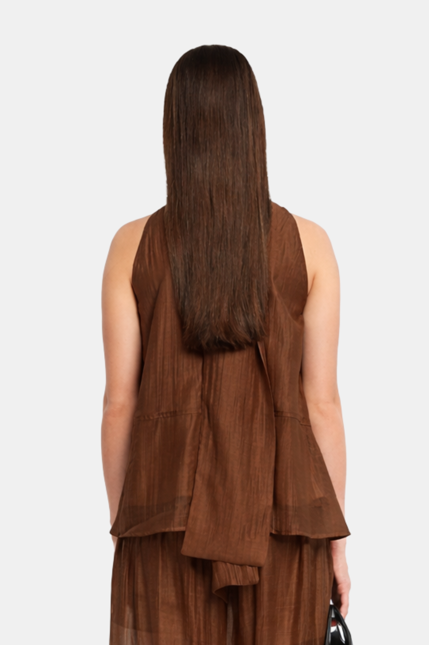 Airy sleeveless top in a lightweight, semi-sheer textured fabric. Designed with a high neckline and a relaxed, flowing silhouette that drapes beautifully. Elegant and effortless, perfect to wear with the matching pants or styled with your everyday wardrobe.