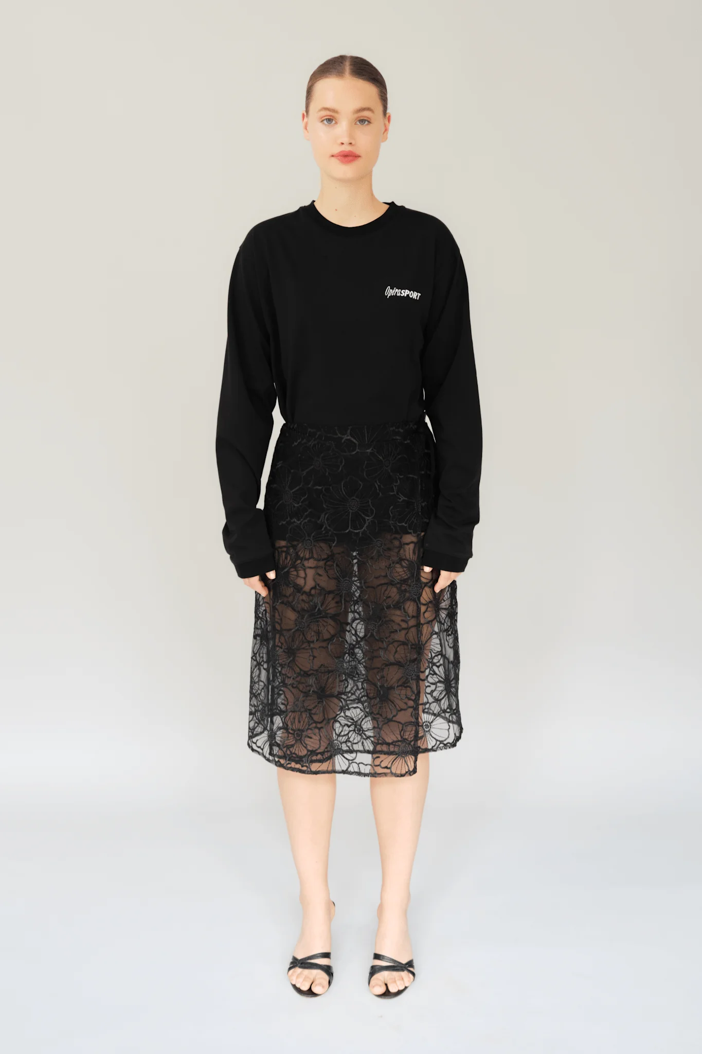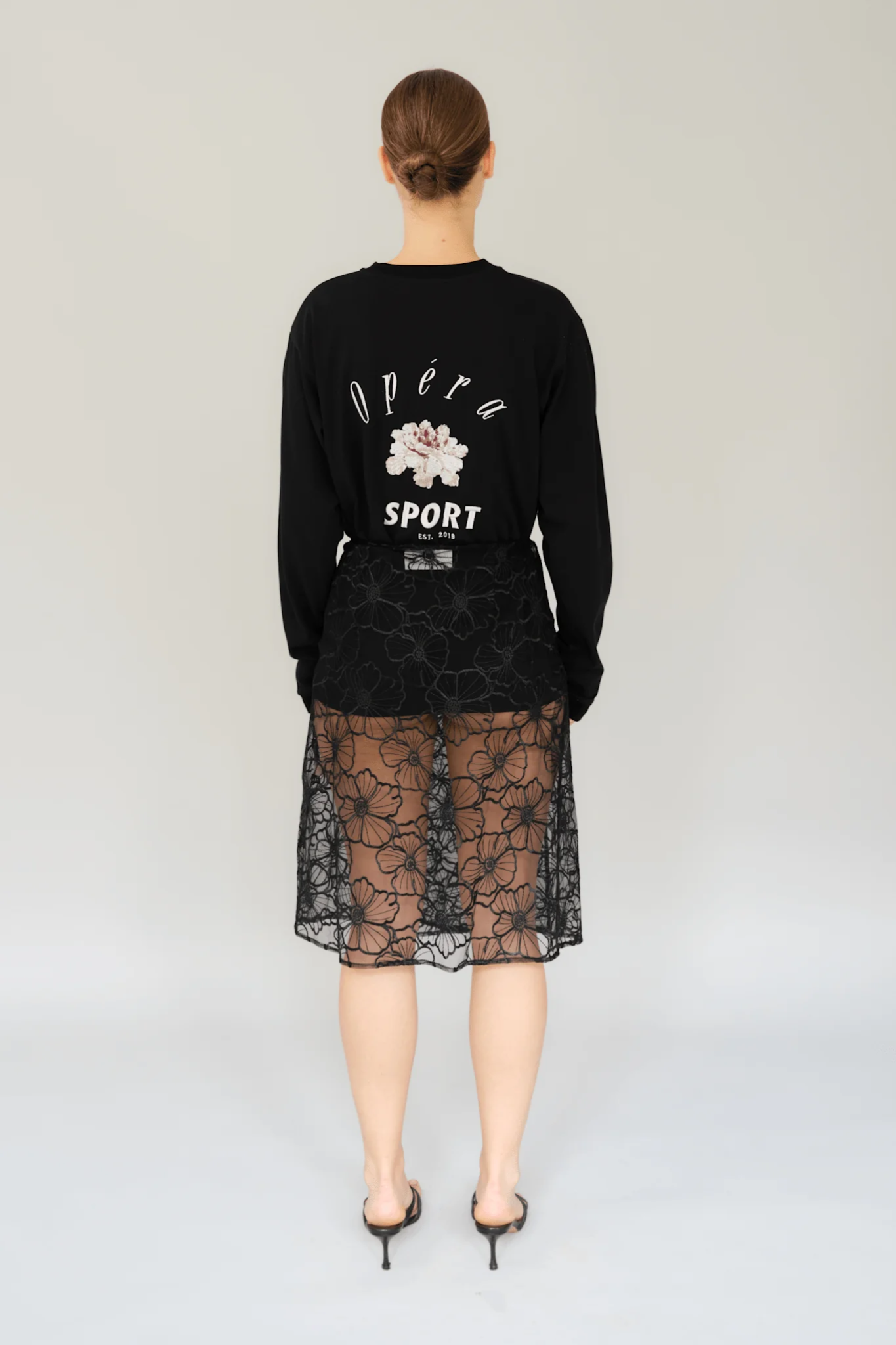 OPÉRA SPORT ALBA LONG SKIRT BLACK is a feminine and versatile lace skirt crafted from sustainable materials—90% recycled polyamide and 10% recycled polyester. Featuring a wraparound design with elongated ties, it creates a delicate bow at the waist for an elegant finish.