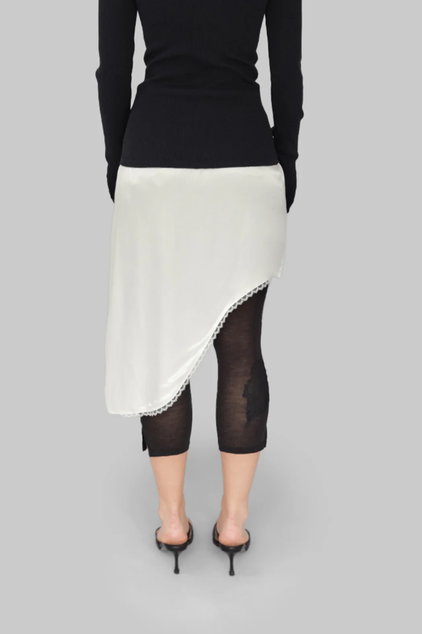 OPÉRA SPORT LEA SKIRT IVORY is an elegant and versatile midi skirt crafted from 100% recycled polyester in a soft ivory shade. Designed with a flattering asymmetrical hem, it is finished with delicate lace trim at the bottom for a feminine and refined touch.
