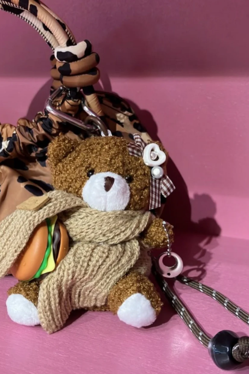Add a playful touch to your accessories with the Sticky Bestie Teddy Bag Charm in Brown. This adorable plush bear is the ultimate snack-loving sidekick, wrapped in a cozy knitted tan scarf and holding a tiny, delicious-looking burger. Its soft curly faux fur, gingham bow, and pearl heart detail make it a standout charm full of personality.