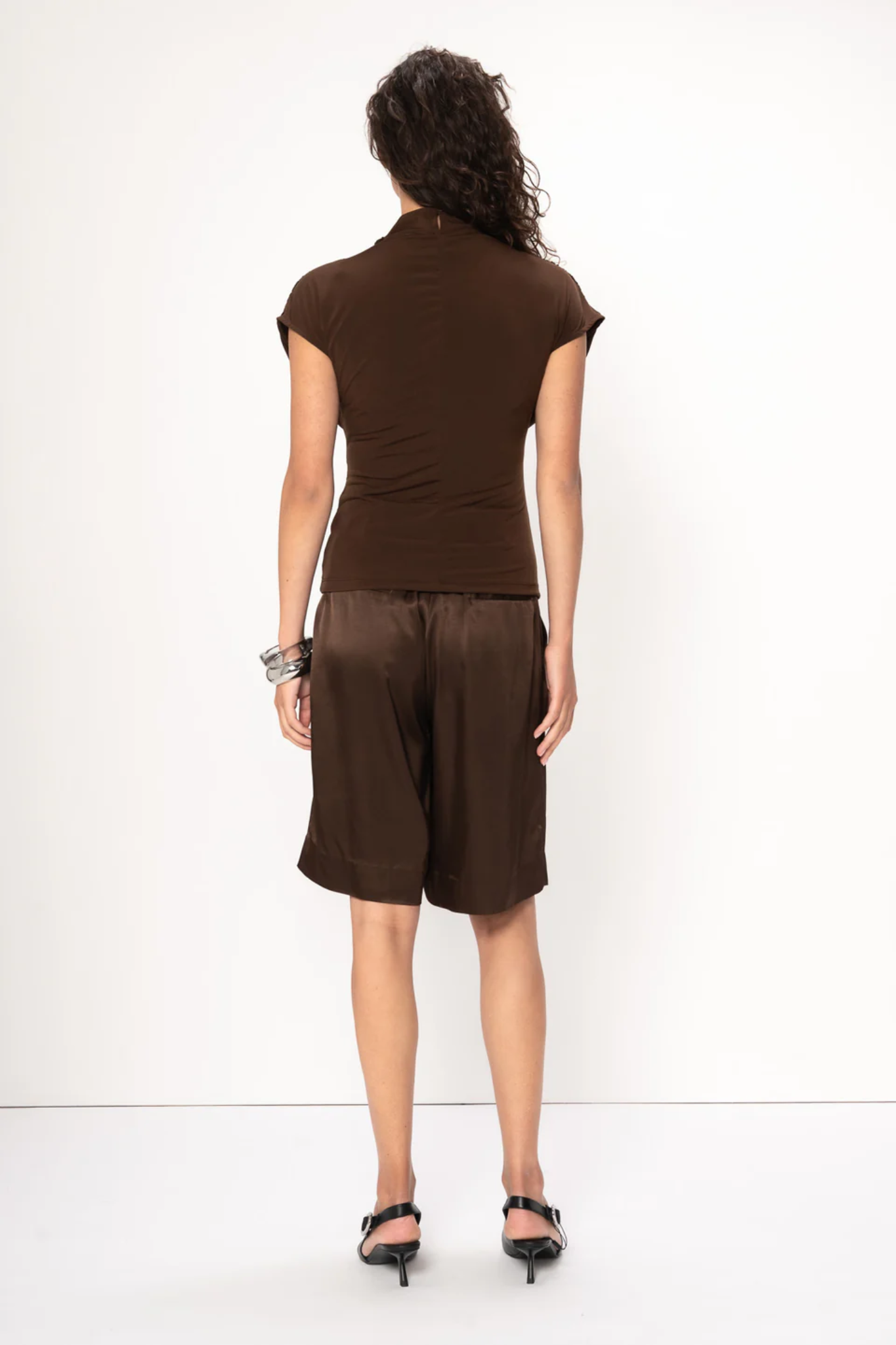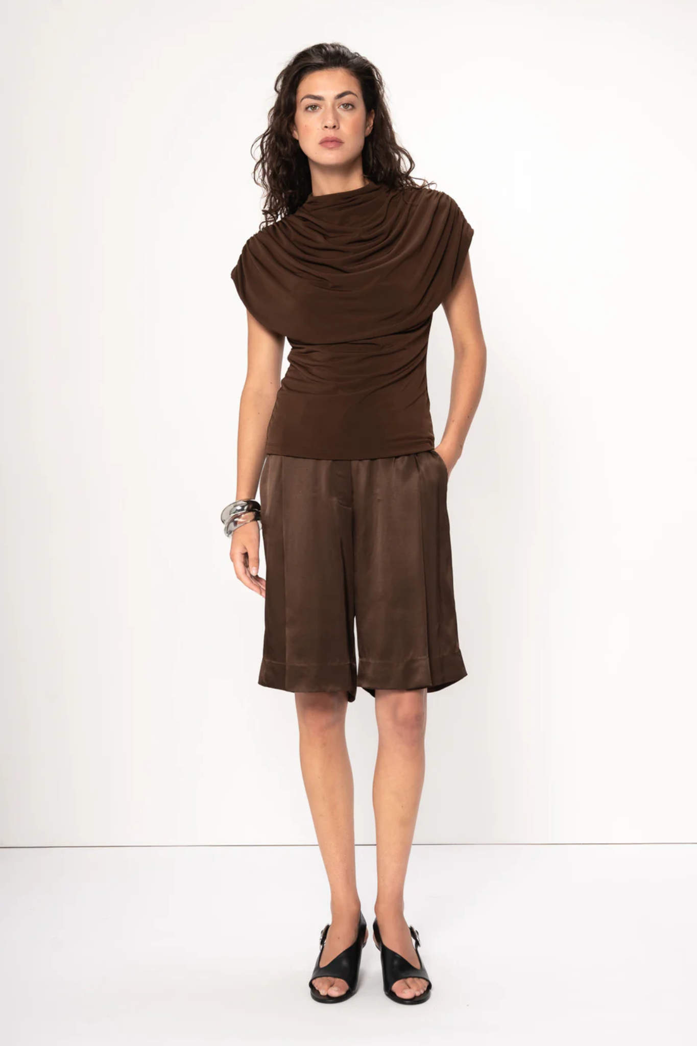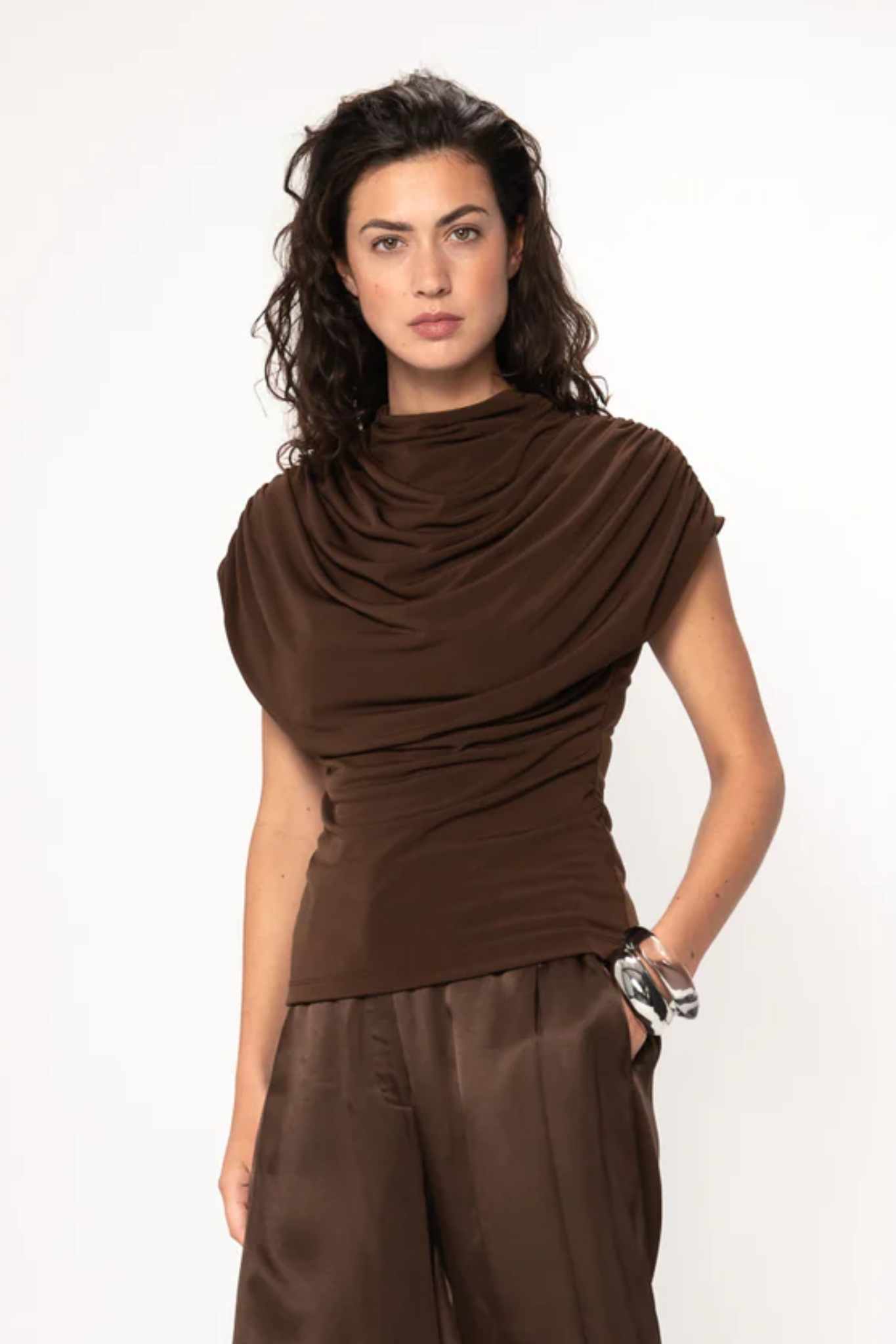 VIVEH RAZA TOP COCONUT MOCHA is a refined sleeveless top crafted from smooth, comfortable jersey. The softly draped front shapes the neckline and upper body, creating an elegant and fluid silhouette, while the lower section sits cleanly against the body for a balanced, flattering fit.