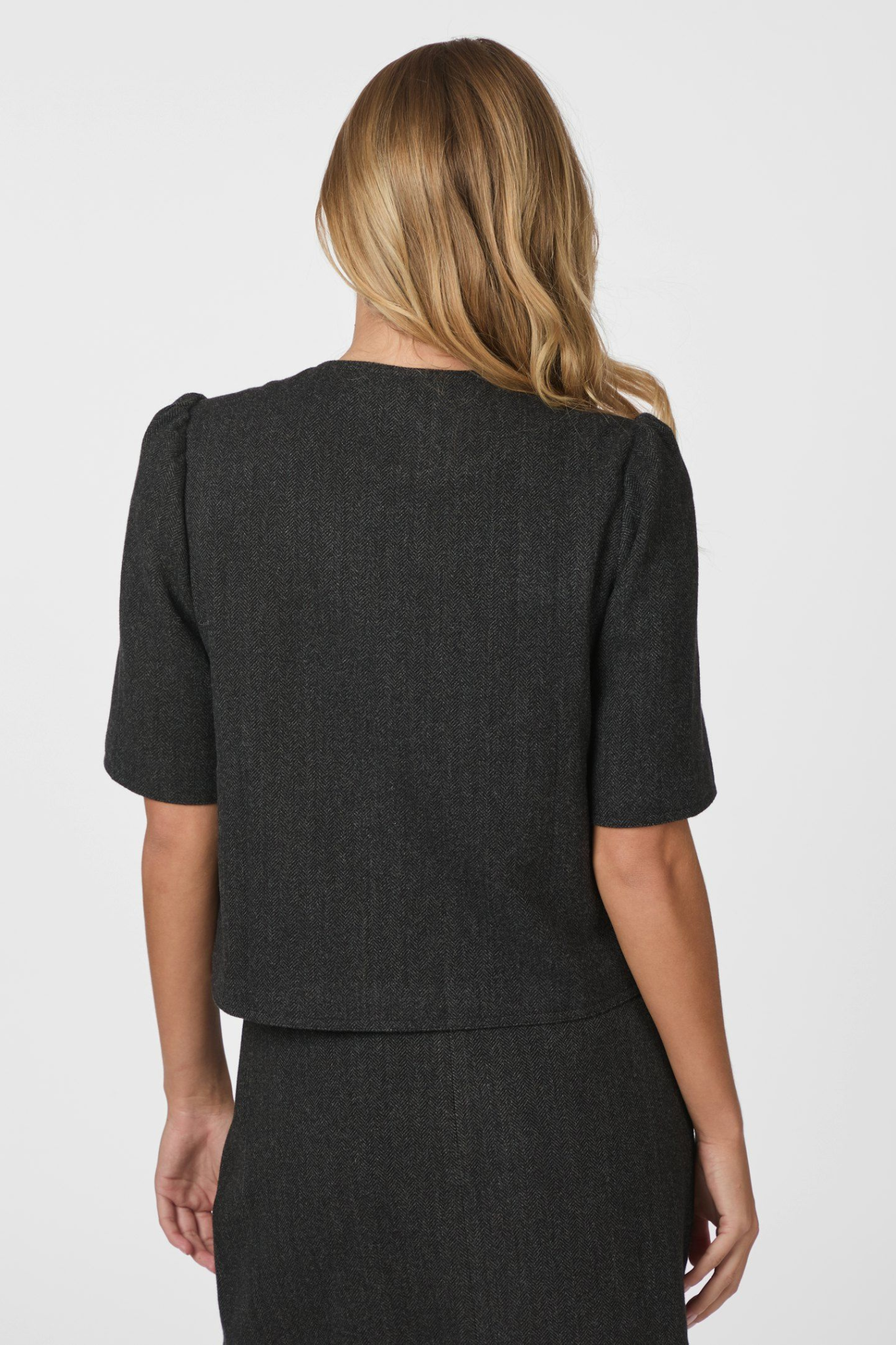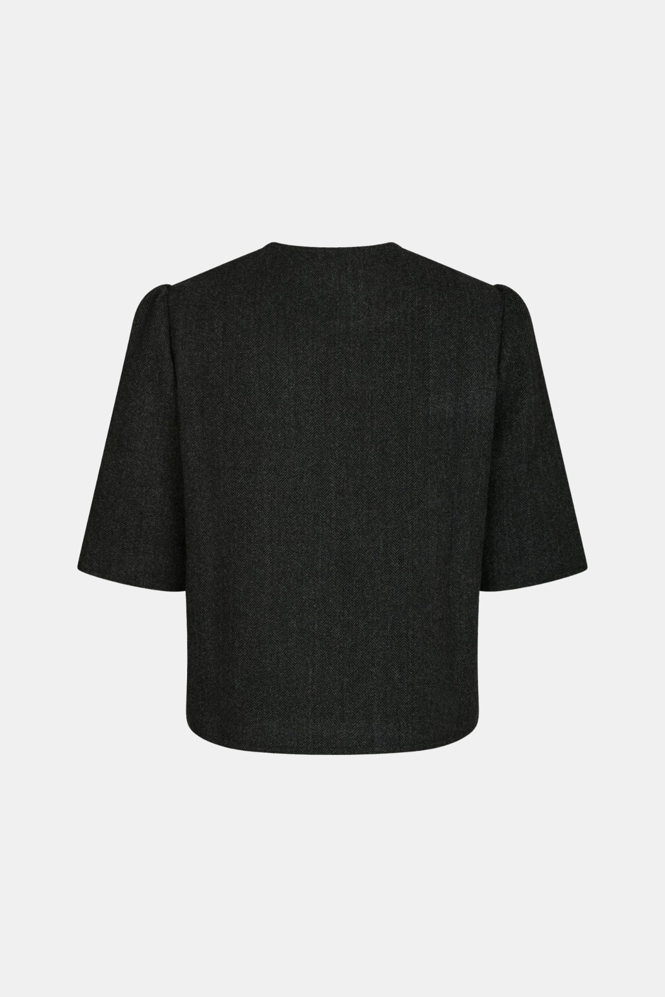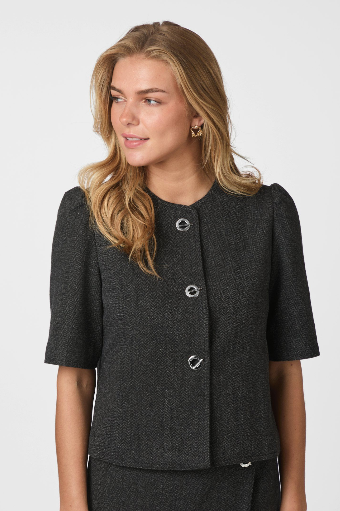 Stylish jacket with curved sleeves and rounded details, crafted from premium herringbone fabric.
