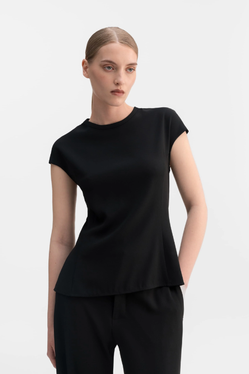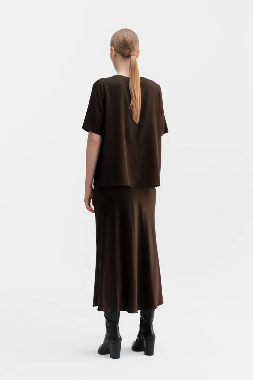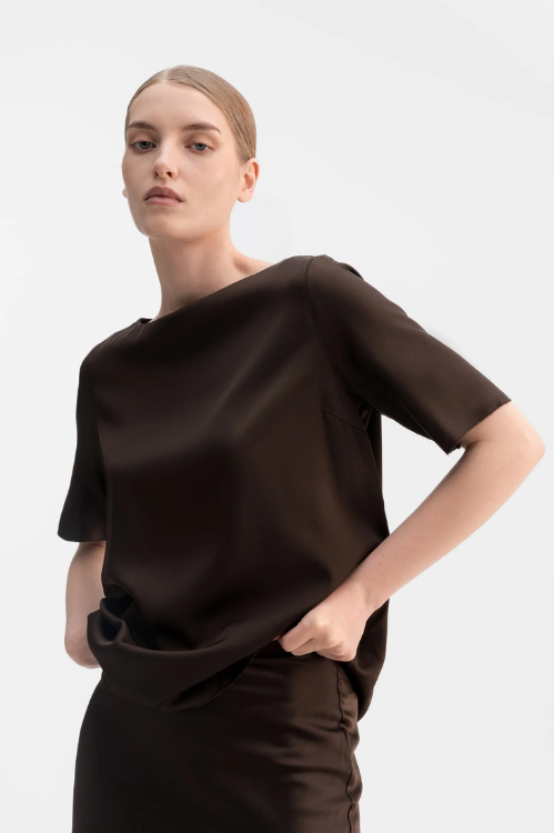 The Yoli Silk Blouse in Dark Brown is crafted from our signature silk-stretch blend, offering a luxurious feel with subtle comfort. Designed with a clean, minimalist look, it features a refined boat neckline and our iconic embroidery seam along the spine for an elegant detail.